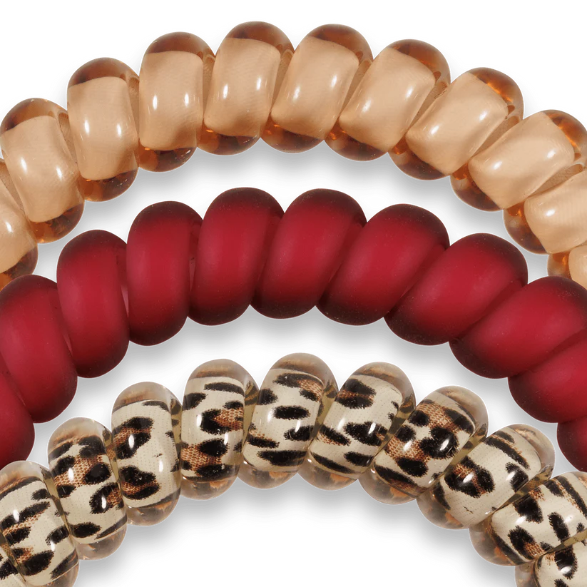 Wild Side Small Teleties in Burgundy and Beige provide a strong, no-rip hold that keeps hair secure all day without causing breakage or headaches. Designed to be gentle on your hair, these durable and waterproof ties also double as stylish wrist accessories. Sold in convenient packs of three, they’re perfect for everyday use and all occasions, combining function with fashion seamlessly.
