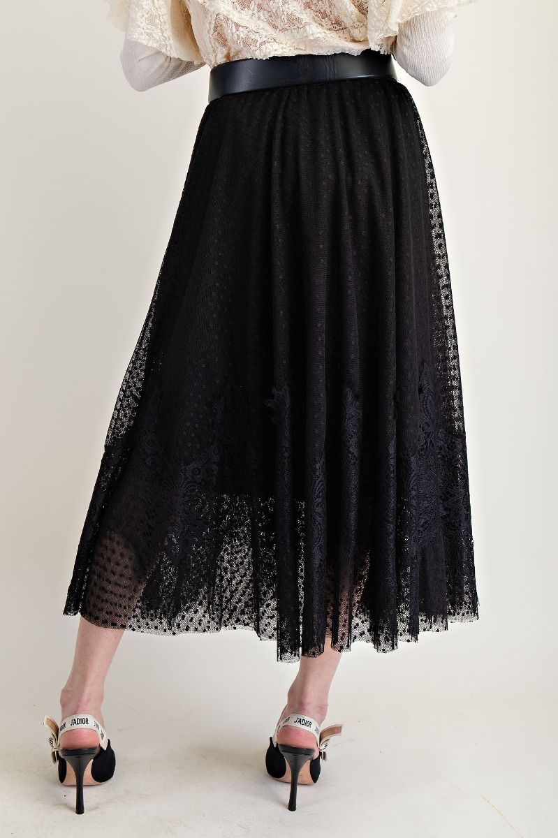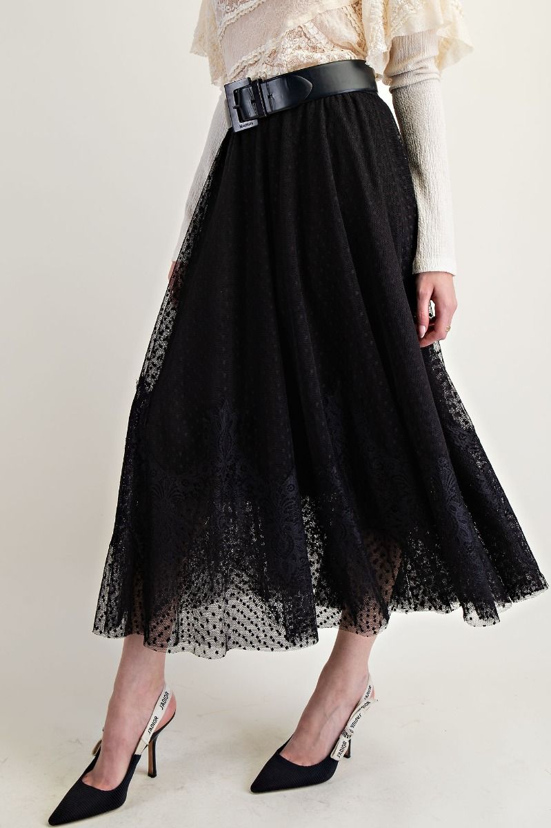 This Dot Mesh Lace Wide Skirt features delicate lace detailing at the hem and a lightweight, flowy silhouette for effortless style. With a comfortable elastic waistband and relaxed, loose fit, it offers both ease and elegance. Fully lined for coverage, this skirt measures 33" in length and has a 13.25" waist in small size, making it a versatile addition to your wardrobe for any occasion.