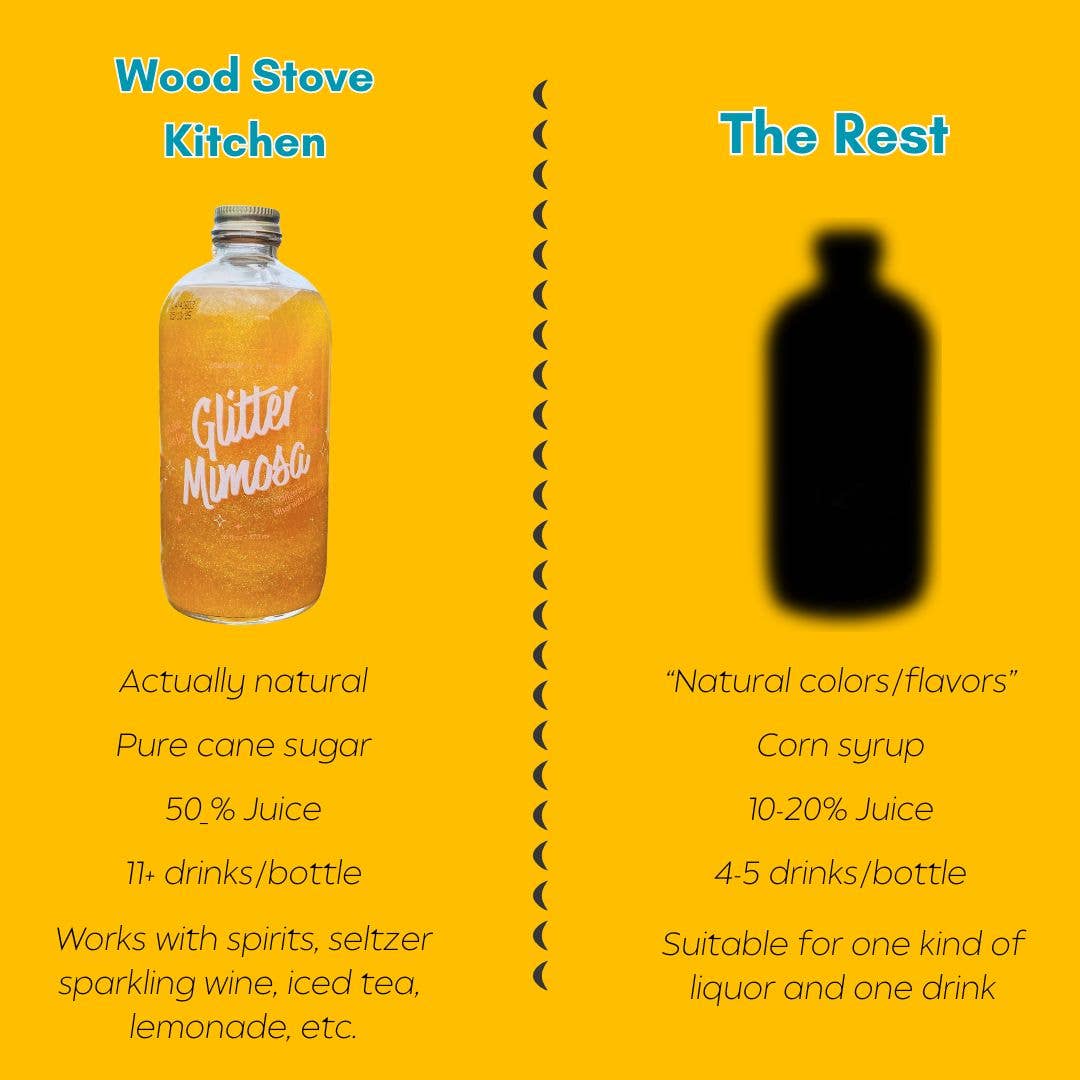Get your sparkle on with our concentrated, glitter-infused Glitter Mimosa Mixer. It contains tangerine and mango in addition to FDA-approved edible glitter that is made from the mineral mica. There's absolutely zero micro-plastics or anything artificial. Just add 1/2 to 1 ounce of this mixer to a glass of sparkling wine or sparkling juice for a mimosa or "mock-mosa". Or follow our lead and add 1 ounce of this mixer to 1-2 ounces of white rum and a splash of seltzer on top for a fun, tropical cocktail. Each 16 fl oz glass bottle makes 16-32 drinks!
