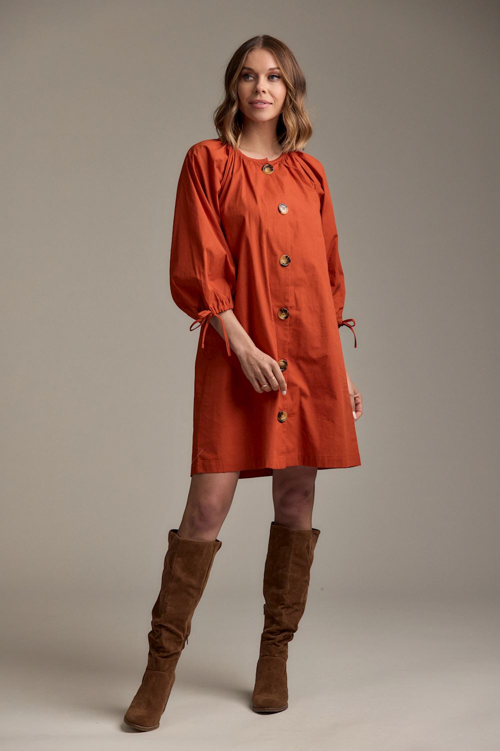 This cotton poplin dress combines classic style with modern details, featuring tortoise buttons and balloon sleeves with adjustable drawstring ties for a customizable fit. Measuring approximately 35 1/2" from shoulder to hem on size small, it offers a flattering silhouette perfect for everyday wear or special occasions. The breathable fabric ensures comfort throughout the day, making it a versatile addition to your wardrobe.