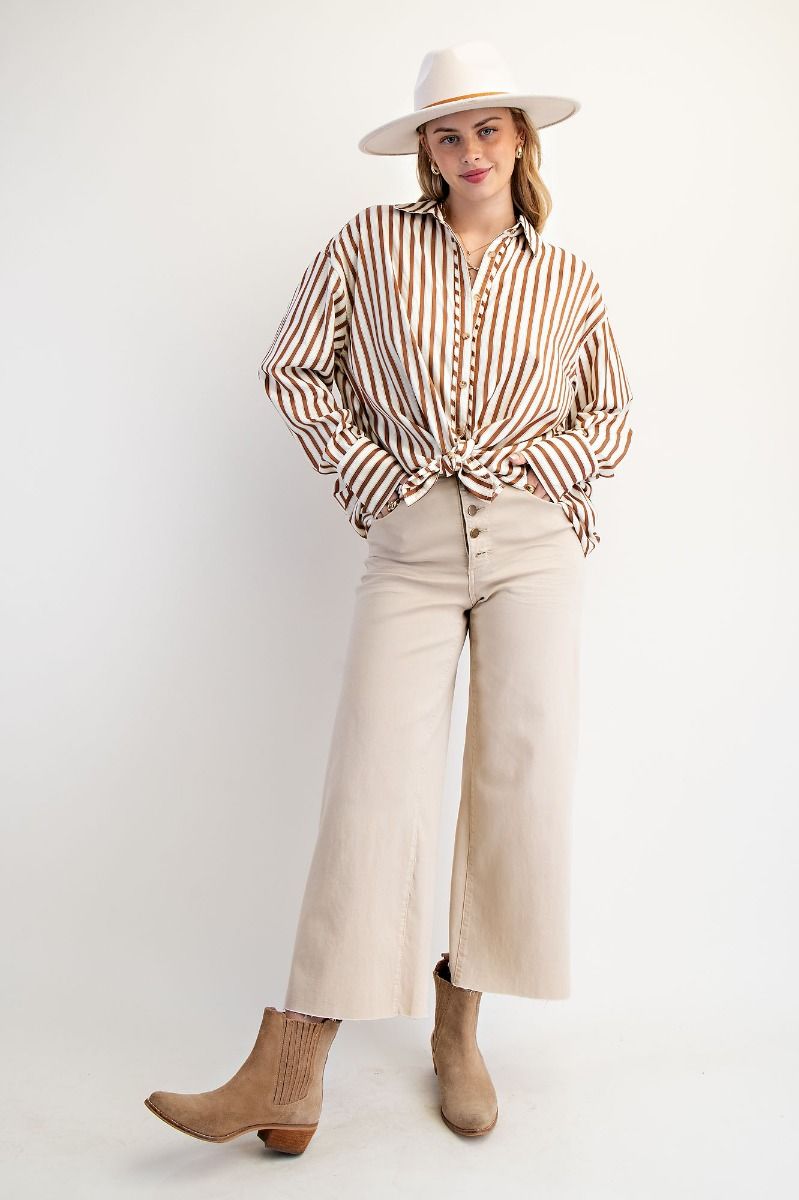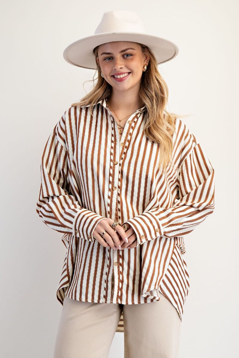 Elevate your wardrobe with the Stripe Button Down Woven Shirt, featuring a relaxed, loose fit for all-day comfort. This long-sleeve shirt offers a classic collared neckline and a full button front closure, perfect for layering or wearing on its own. The curved hemline adds a stylish touch, while small size measurements ensure a flattering fit with a length of 27.75" and bust of 24.5". Ideal for casual or office wear, this versatile shirt combines comfort and timeless style effortlessly.