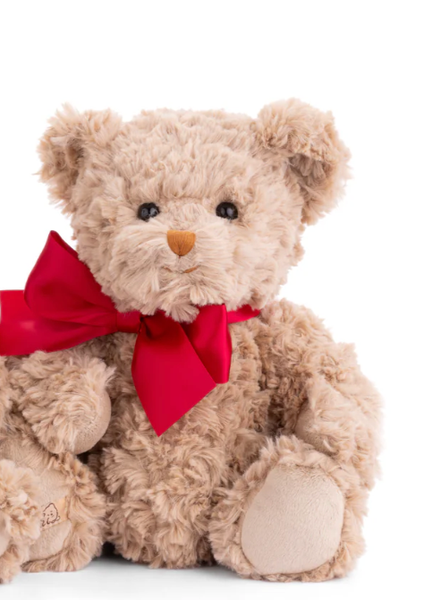Say hello to Christian, the softly shimmering star of snuggle time. Designed in Sweden, this heirloom-quality teddy brings serene, moonlit charm to nurseries and cozy corners alike. His caramel plush is irresistibly huggable, while a red satin bow adds a whisper of Scandinavian elegance. From bedtime stories to keepsake shelves, Christian is made to be loved for a lifetime. Perfect as a christening gift, nursery décor, or cherished companion, this premium Swedish bear combines timeless design with exceptional softness for generations of cuddles and memories.