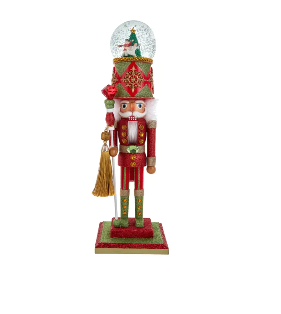 The 20" Dance of the Sugarplum Fairy Nutcracker by Kurt Adler uniquely blends festive tradition with interactive charm. Featuring a classic nutcracker wearing a whimsical water globe hat filled with swirling snowflakes and holiday scenes, this piece brings enchanting seasonal ambiance to any space. Winding it up triggers a joyful holiday tune, enhancing your Christmas decor with sound and motion. Meticulously detailed and visually captivating, this musical water globe nutcracker adds magic and nostalgia to your celebrations. Perfect for creating a memorable holiday atmosphere that delights guests and family alike.