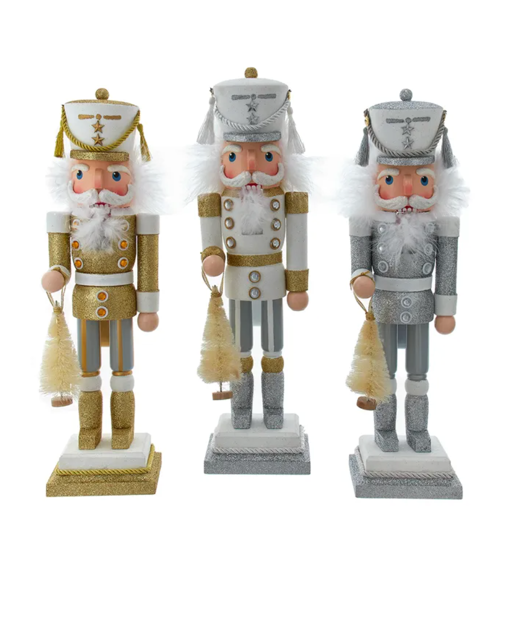 Stand out with Kurt Adler's 15" Soldier Nutcrackers, a trio of meticulously crafted holiday treasures available in white, gold, and silver finishes. Each piece combines traditional soldier aesthetics with contemporary elegance, delivering sophisticated seasonal décor that complements any Christmas display. Featuring intricate detailing and a timeless design, these nutcrackers appeal to holiday enthusiasts and serious collectors alike. Transform your festive space with these premium decorative pieces that merge classic holiday charm with refined, modern styling for an unforgettable seasonal presentation.