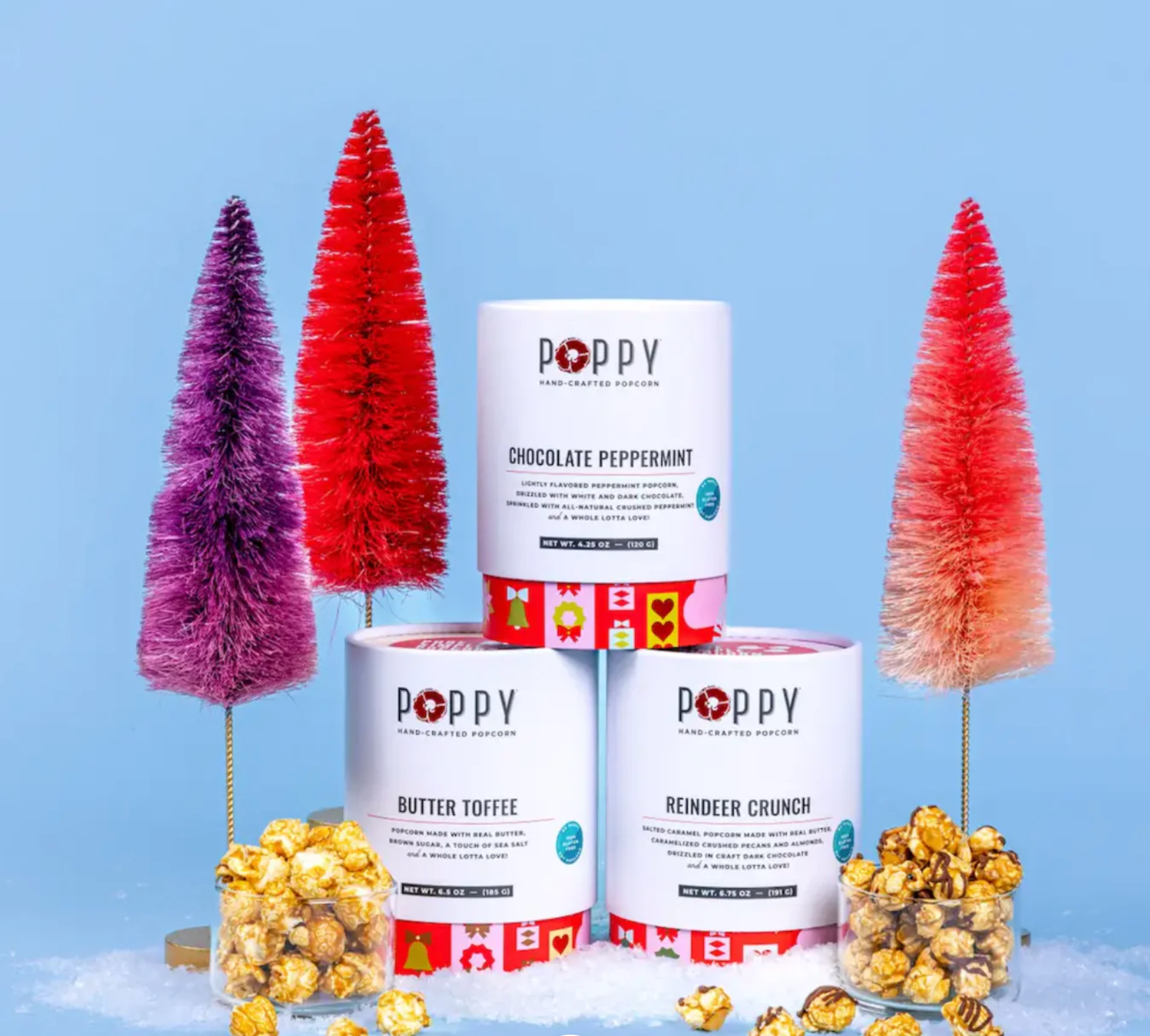 Experience festive snacking with the Holiday Cylinder Trio Popcorn, featuring three hand-crafted flavors in a gift-ready box. Enjoy rich Butter Toffee popcorn made with real butter, brown sugar, and sea salt; Peppermint Bark popcorn drizzled with chocolate and topped with crushed peppermint candies; and Reindeer Crunch, a delightful blend of salted caramel popcorn, caramelized pecans and almonds, finished with a chocolate drizzle. Perfect for holiday gatherings or gifting, this trio offers a delicious treat that combines classic flavors with premium ingredients.