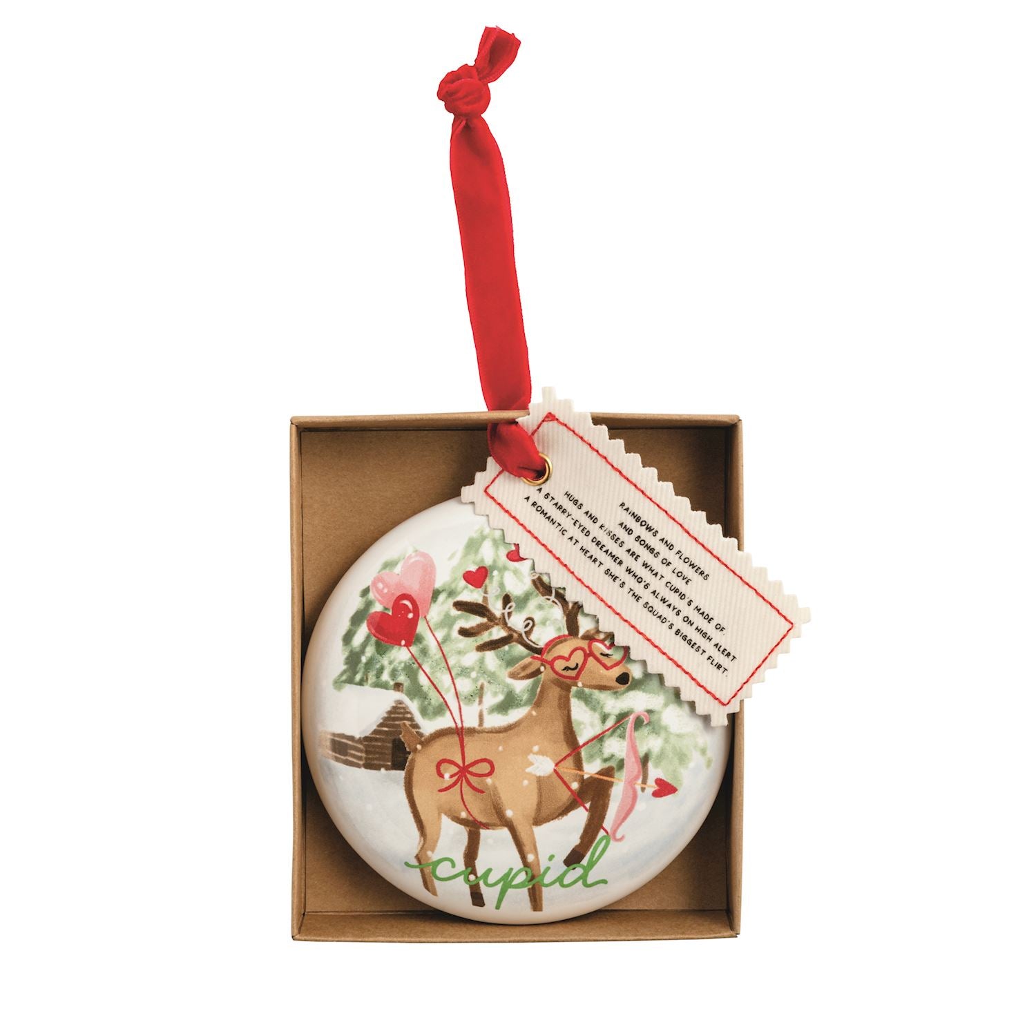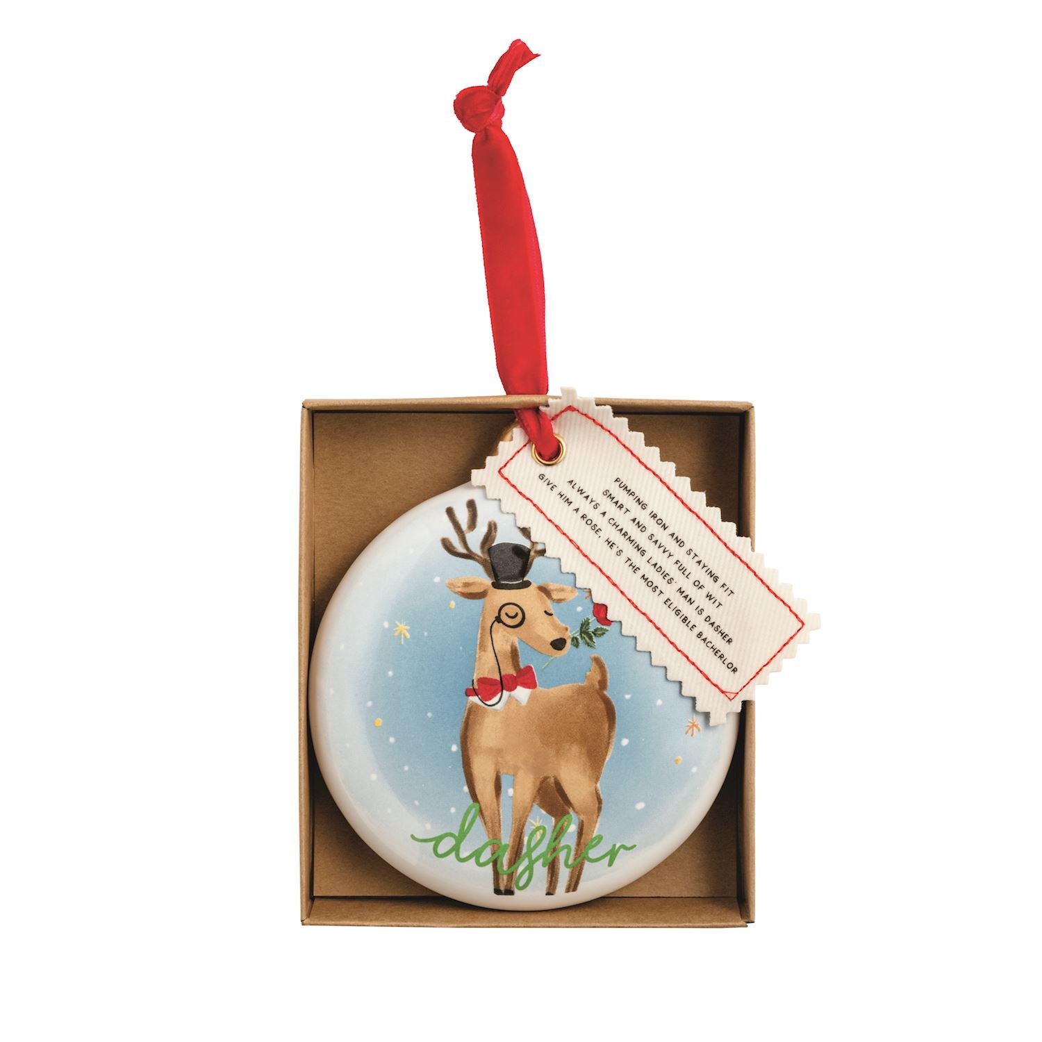 Add a festive touch with this Reindeer Ornament, crafted from durable ceramic and highlighted by a stylish canvas accent tag. The soft velvet hanger ensures easy display on your tree or around your home, combining elegance with holiday charm. Perfect for seasonal decorating or gifting, this ornament brings a classic holiday feel to any space.