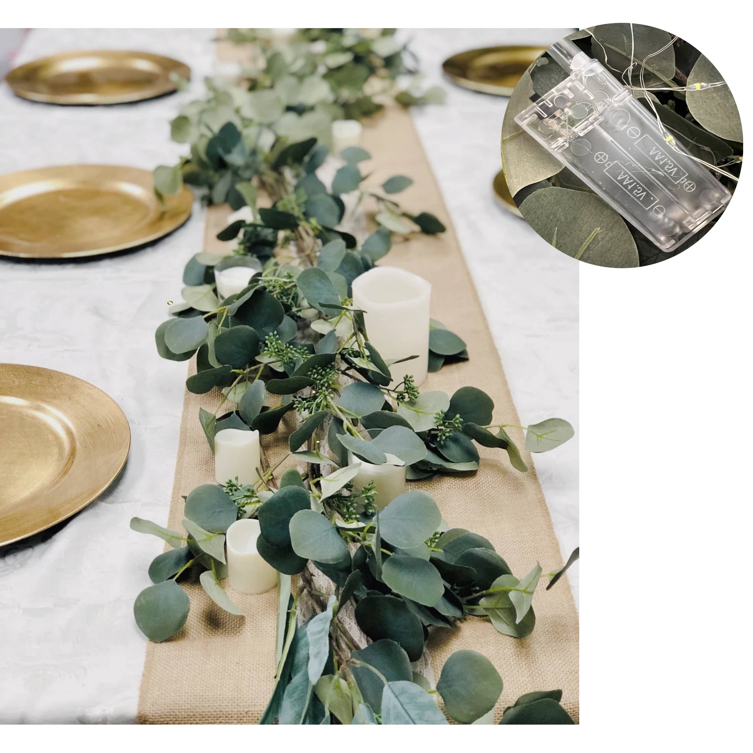 Grey-green eucalyptus garland with seeded accents, featuring LED string lights. Battery required (not included). This grey-green eucalyptus garland with seeded accents pairs beautifully with candles for a warm and inviting decor setup. The lifelike, bendable twigs allow for easy shaping around candle arrangements, creating a soft, natural ambiance perfect for weddings, holiday displays, or home decor. The perfect addition to any table arrangements. Dimension: 70" Long.