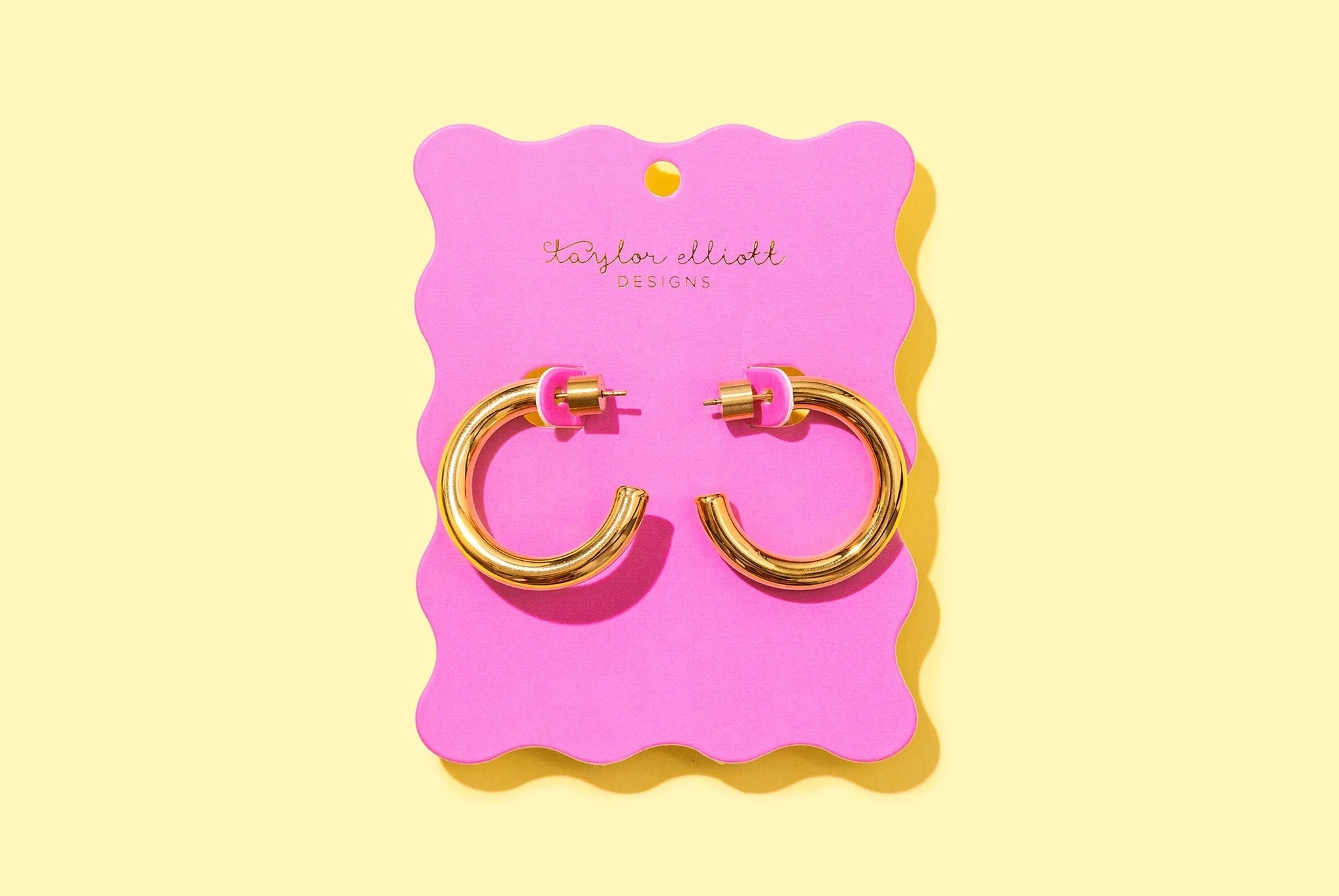 The Terry Gold Hoop Earrings Medium offer a classic gold hoop design perfectly sized at 1.18" diameter for everyday wear. Crafted from hypoallergenic surgical stainless steel and plated in 14k gold, these lightweight earrings are nickel and lead free, ensuring comfort for sensitive ears. Imported and displayed on a backer card, they provide timeless style and versatility for any occasion.