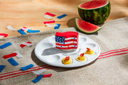 Illuminate your patriotism with our hand-painted American Flag Light Up Sitter. Featuring multi-colored red and blue LED lights, this ceramic sitter is the perfect home decor piece for any proud American. Battery included for convenience.