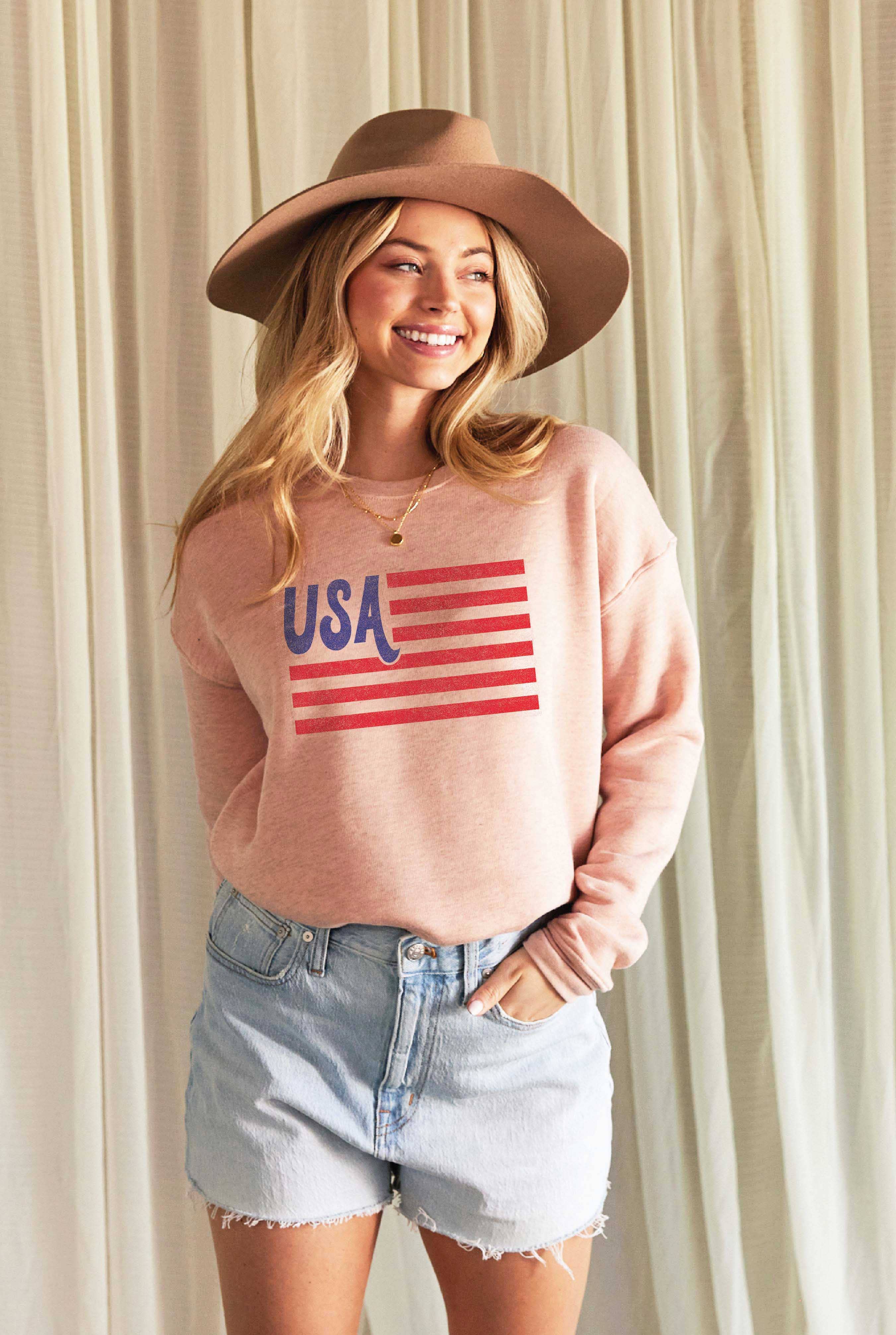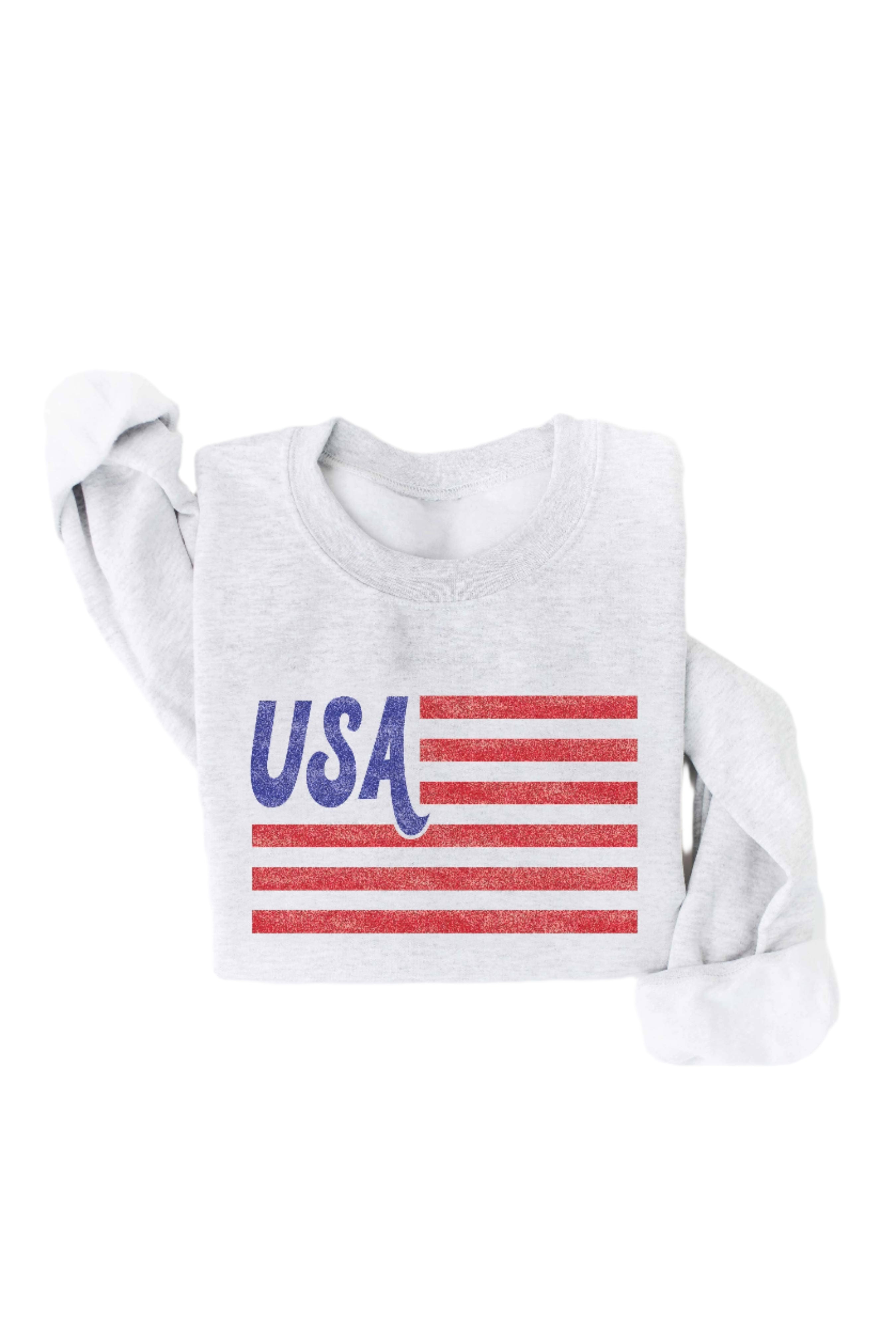 The USA FLAG Graphic Sweatshirt is a unisex fleece pullover designed for a relaxed fit and everyday comfort. Made from soft sponge fleece fabric, this crewneck sweatshirt offers year-round layering with ribbed cuffs and waistband for a secure fit. Its stylish fleece material and classic design make it an ideal choice for casual wear.
