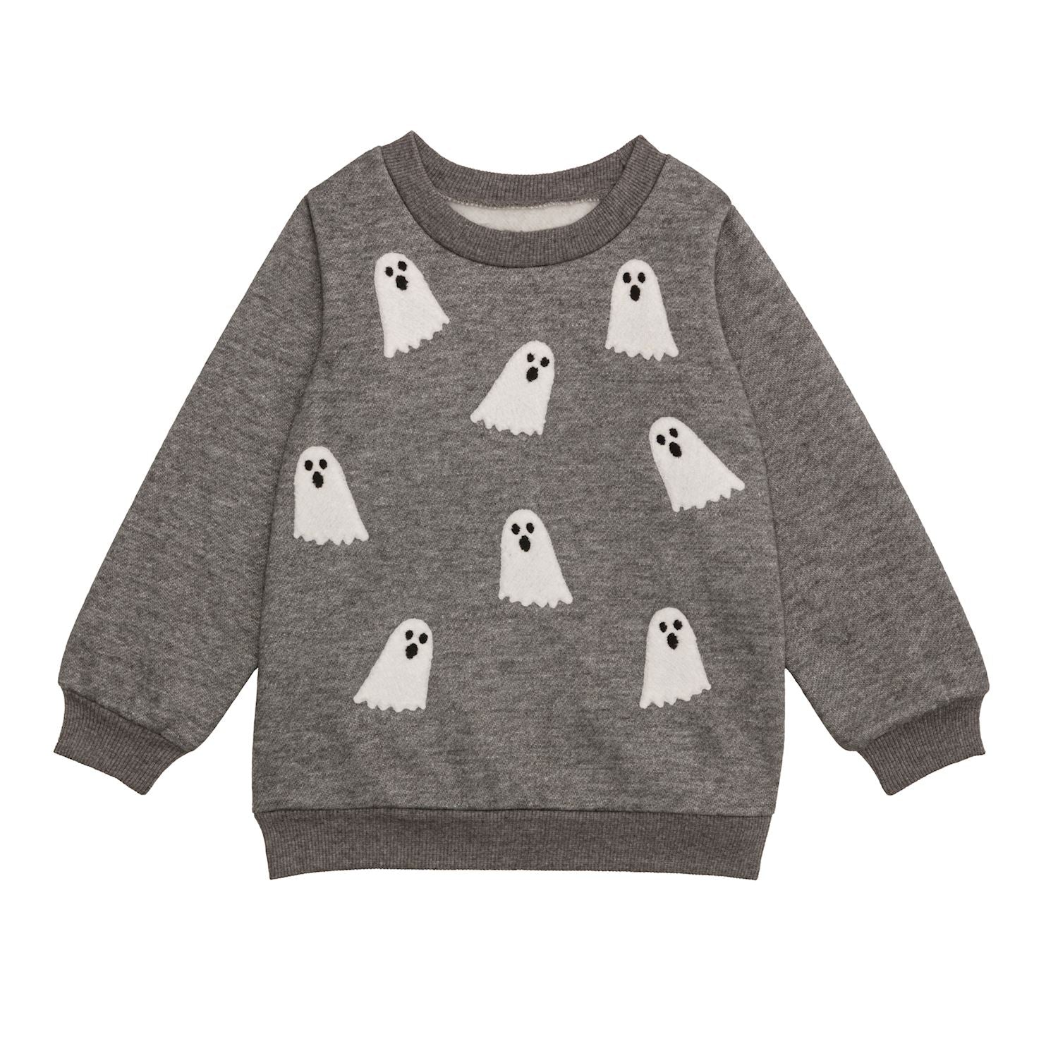 The Sparkle Ghost Sweatshirt is a pink brushed French terry pullover adorned with sequin ghost designs. It includes ribbed details on the neckline, cuffs, and hem for a comfortable, stylish fit.
