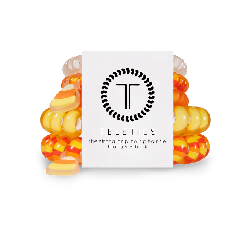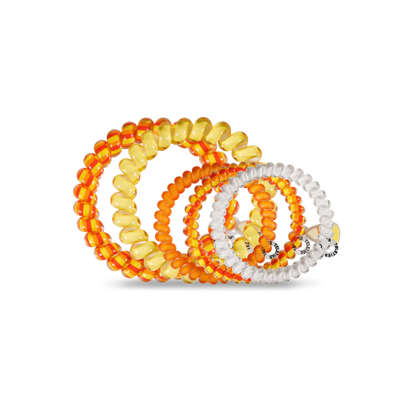 Candy Corn Teleties Mix Pack in Yellow and Orange delivers a strong, no-rip hold that’s gentle on all hair types. These durable, water-resistant hair ties provide all-day comfort without causing breakage, headaches, or creases. When not securing your hair, they make a stylish bracelet accessory. This five-pack includes three small and two large ties, perfect for versatile use throughout the year. Keep your hair effortlessly secure and fashionable with these essential hair accessories.