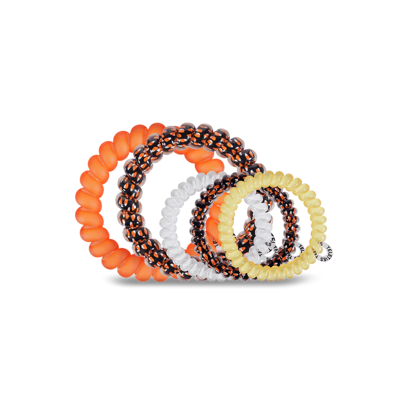 Sweet Haul Teleties in Orange, Black, Yellow, and White provide a secure, no-rip hold suitable for all hair types. These durable, waterproof hair ties prevent breakage, headaches, and creases while doubling as a fashionable bracelet when not in use. This versatile five-pack includes three small and two large ties, making them perfect for any occasion and everyday wear. Keep your hair effortlessly stylish and protected all year round with these essential accessories.
