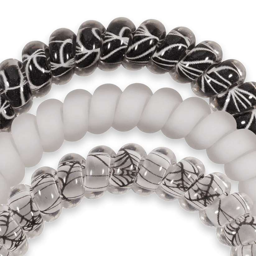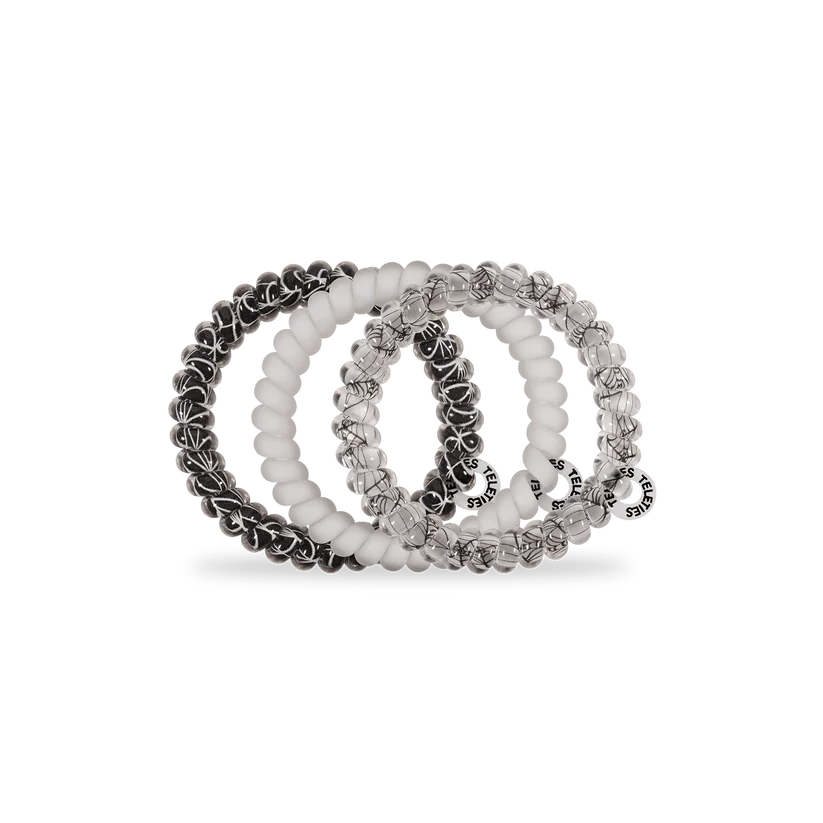 Webbed Small Teleties in Black and White provide a strong, no-rip hold that protects hair from breakage, headaches, and creases. These durable, waterproof hair ties suit all hair types and also serve as stylish bracelets when not in use. Sold in packs of three, they’re perfect for everyday wear and reliable hair support all year long. Elevate your hair routine with these essential, versatile accessories.
