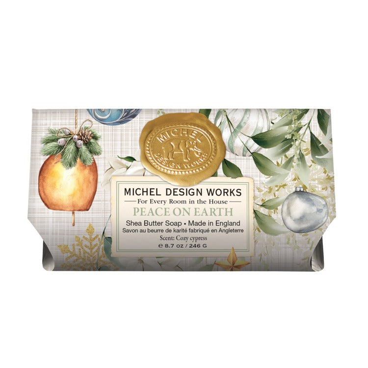 Indulge in the luxurious scent of Peace on Earth with this large bath soap bar from MDW. This beautifully crafted soap is enriched with moisturizing ingredients to leave your skin feeling soft and refreshed. The calming aroma of Peace on Earth will transport you to a state of relaxation and tranquility. Treat yourself to a spa-like experience every time you use this soap. Perfect for gifting or keeping for yourself, this soap bar is a must-have for anyone looking to elevate their bathing routine. Experience the peace and serenity of MDW's Peace on Earth soap bar today.