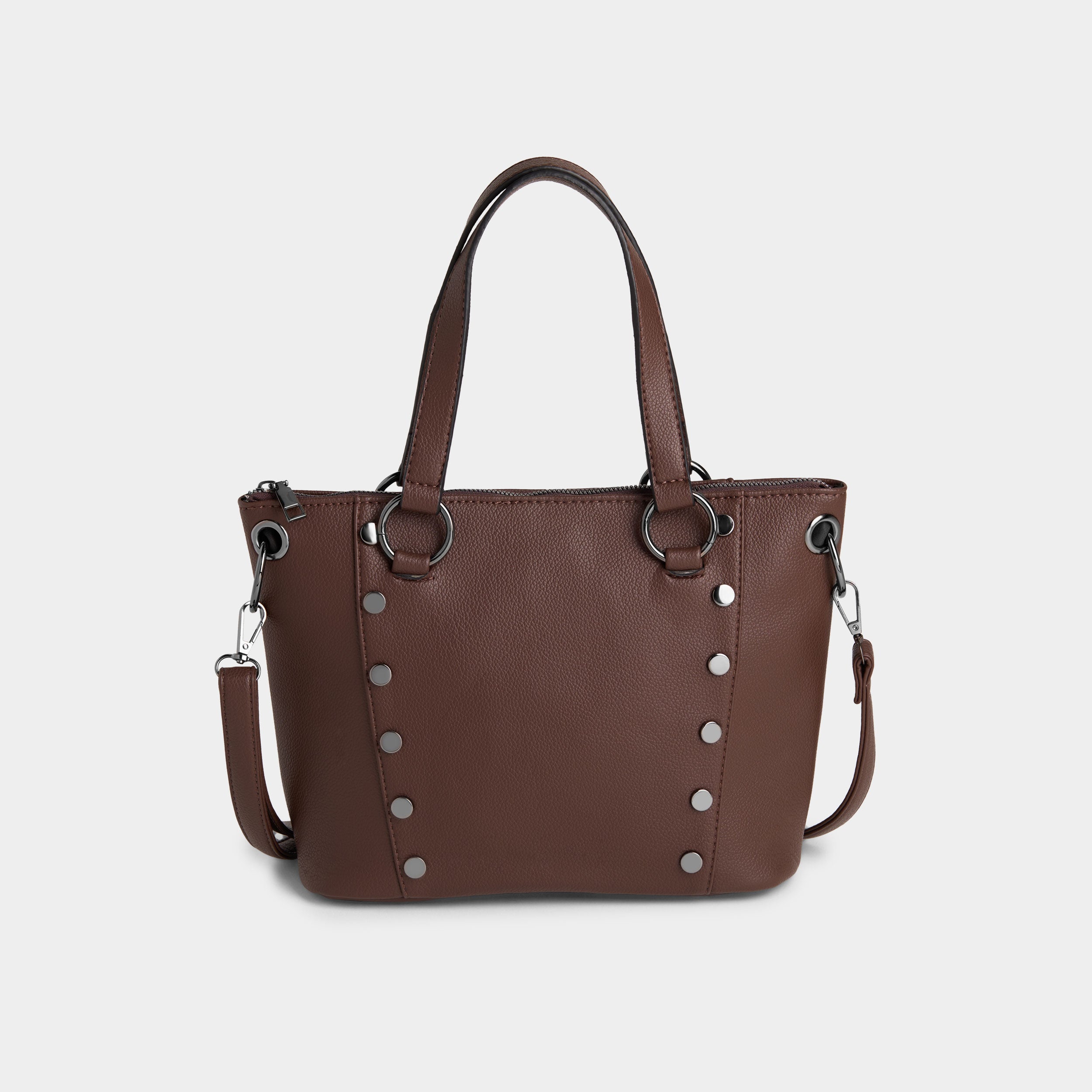 The Evelyn Studded Tote in Chocolate combines stylish design with practical functionality. Crafted with durable materials, this tote features distinctive studded accents that add a chic edge to your everyday look. Spacious enough to carry essentials and more, it’s perfect for work, shopping, or casual outings. The rich chocolate color complements any outfit while ensuring versatility and timeless appeal. Elevate your accessory collection with this standout tote that balances fashion and convenience effortlessly.