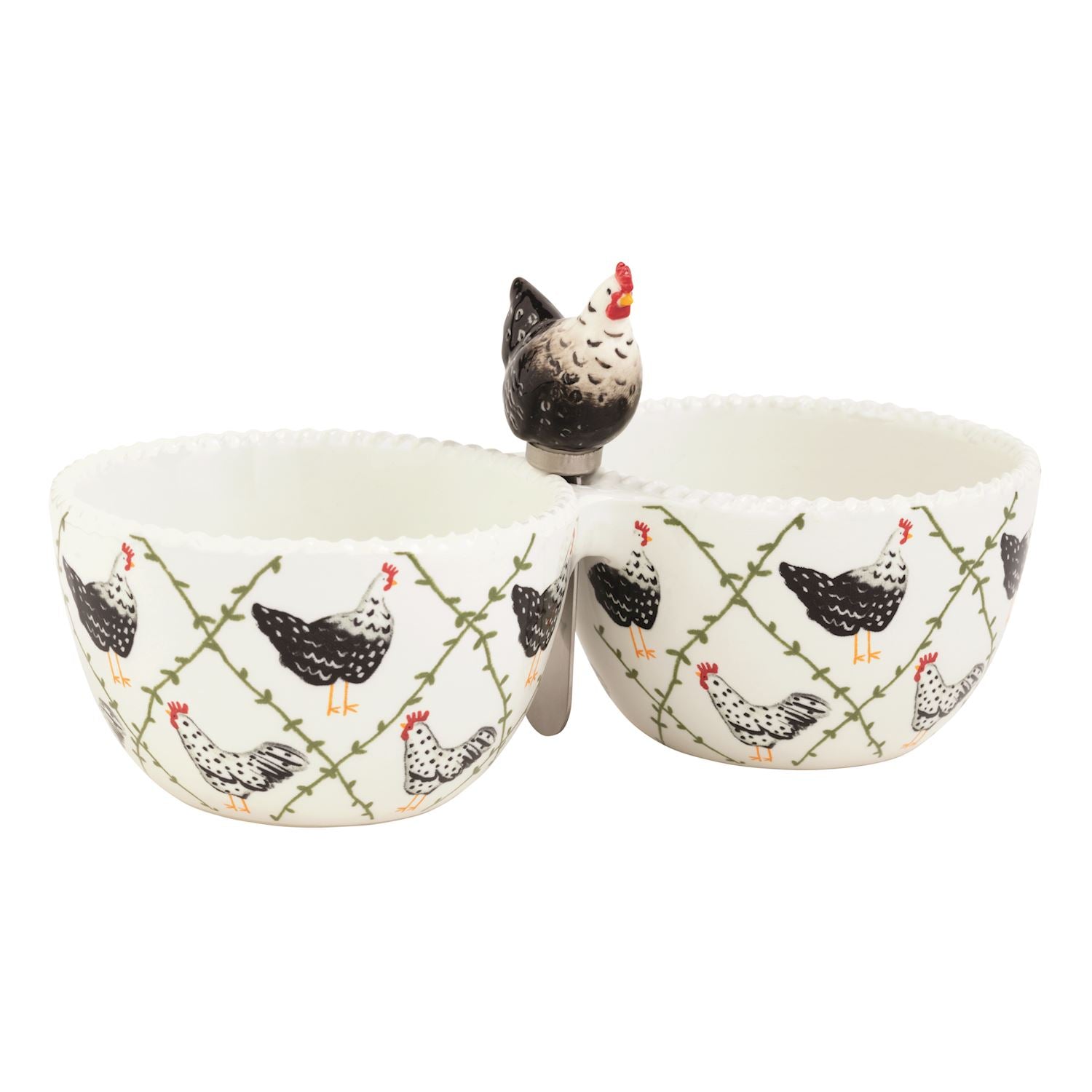 Rooster Double Tidbit Stoneware Server with Spreader Serve appetizers and spreads in style with this charming 2-piece stoneware set. The double tidbit server features a textured rope rim and center slit designed to hold the included stainless steel spreader. Hand-painted rooster detailing on the spreader handle adds rustic character perfect for farmhouse or cottage décor. Ideal for entertaining, cheese boards, or everyday snacking. Durable stoneware construction ensures lasting use for gatherings and special occasions.