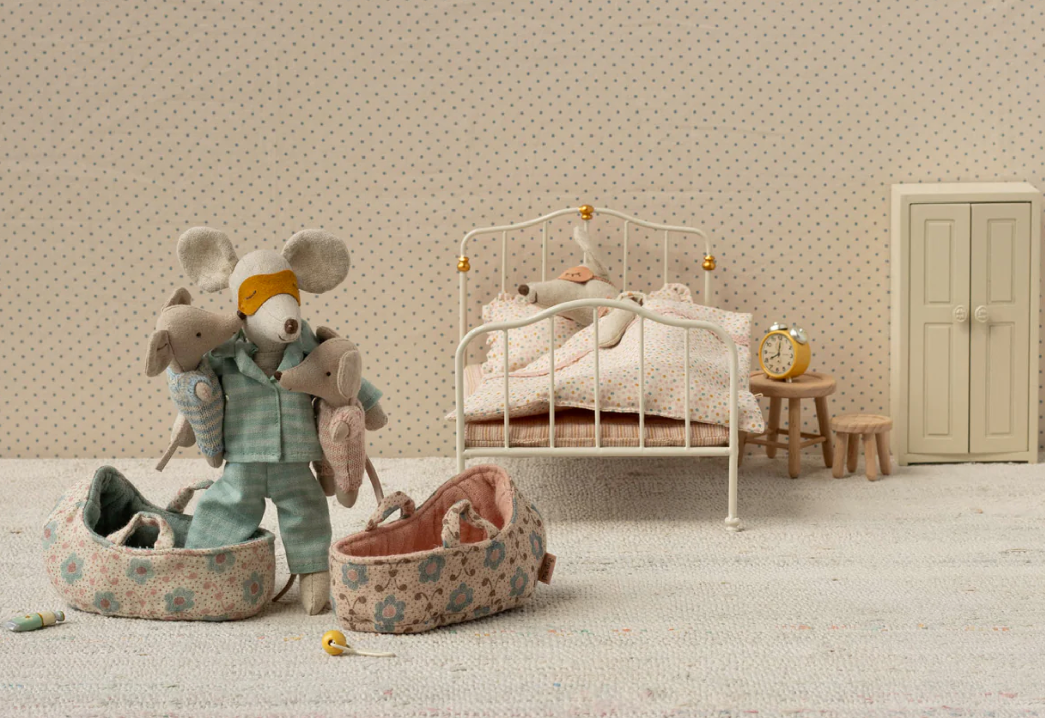 This Maileg Baby Mouse features a soft, striped knitted suit, perfect for little hands. It rests comfortably in a quilted carry cot, designed for peaceful, long naps. Ideal for collectors and children who enjoy nurturing play, this miniature mouse adds charm and warmth to any Maileg mouse collection.