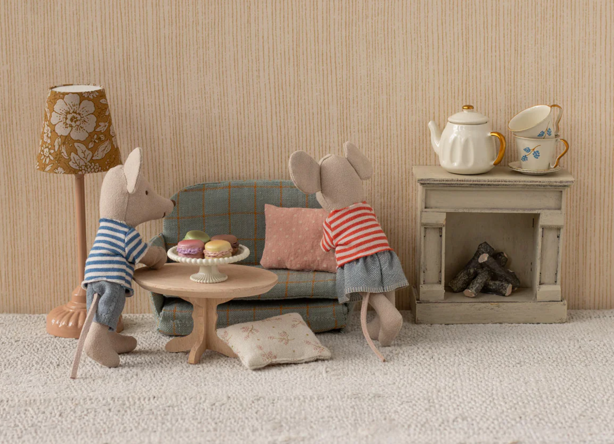 The Maileg Oval Coffee Table in mouse size is expertly crafted from wood to complement your mouse sofa bed perfectly. Designed to fit seamlessly with the SuitCasa collection, this table creates an ideal setting for cozy tea or coffee gatherings. Its compact and elegant design adds charm and functionality to any miniature living space, enhancing your mouse’s home with style and practicality.