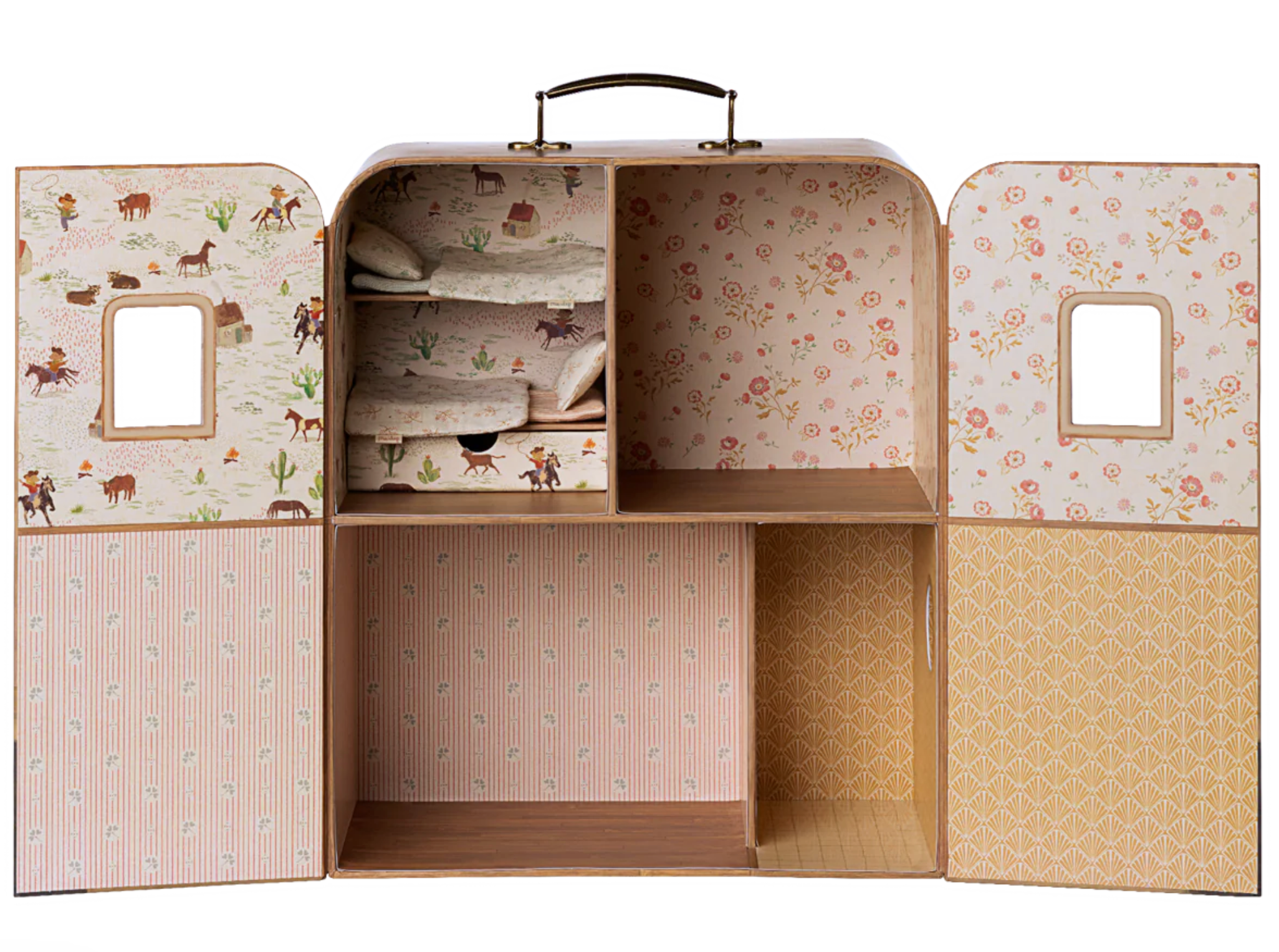The Maileg SuitCasa is a portable mouse house designed for Little Brother and Little Sister mice, featuring a convenient handle for easy transport. When closed, it folds into a suitcase, perfect for taking your mice on the go. Inside, two built-in beds with soft bedding offer a cozy sleep space, while ample room allows for adding miniature furniture and accessories to customize a charming, mobile home. Mice and furniture are sold separately, letting you create the perfect mouse-sized retreat.