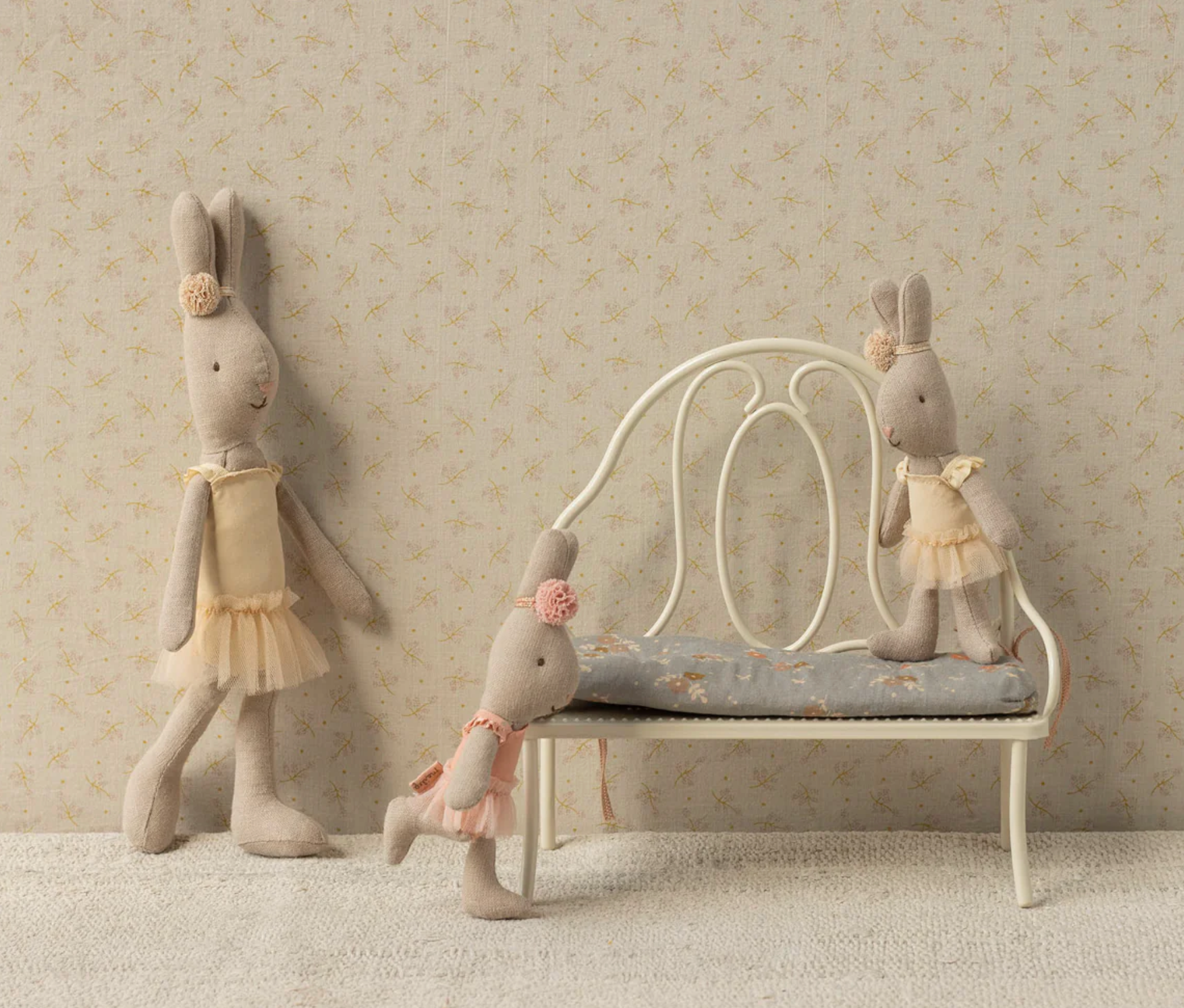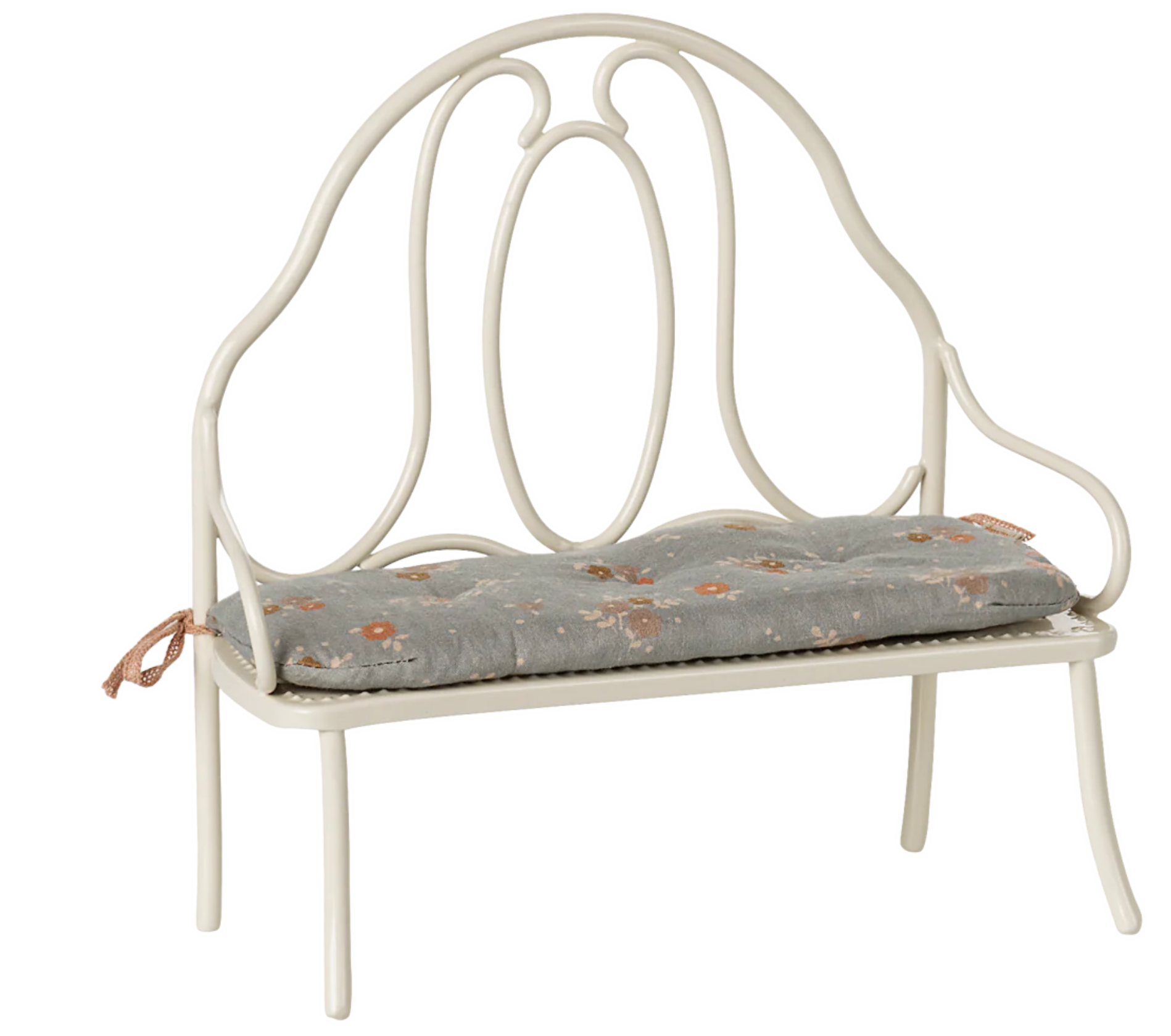 This charming Maileg Vintage Bench features a soft cushion for added comfort, making it ideal for a cozy rest. Designed to perfectly fit Maileg bunny and rabbit sizes 1 and 2, this miniature bench adds a nostalgic touch to any dollhouse or play scene. Its vintage style enhances the charm and authenticity of your miniature collection.
