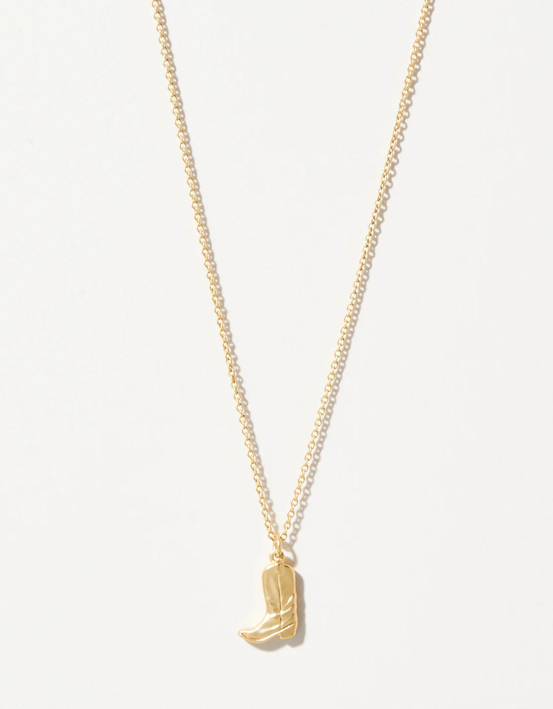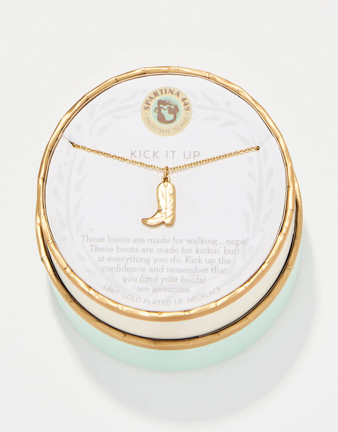 Wear our Kick It Up Necklace as a reminder that you are awesome. Featuring a cowgirl boot charm, this special piece comes packaged inside a beautiful box with the message: "These boots are made for walking... nope! These boots are made for kickin'' butt at everything you do. Kick up the confidence and remember that you (and your boots) are awesome."