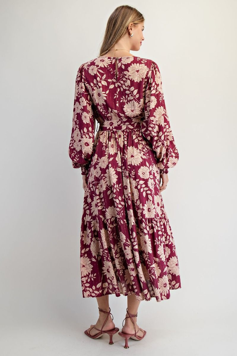 Embrace fall’s charm with this Floral Printed Wine Dress featuring a flattering round neckline and long balloon sleeves finished with smocked cuffs for added comfort. Crafted from lightweight, flowy fabric, it offers an elegant silhouette while keeping you cozy. Practical side pockets blend style with convenience. Designed for small measurements, it measures 48.5" in length and 18" across the bust, making it a perfect choice for seasonal outings and everyday wear. Combine comfort and fashion effortlessly this fall with this versatile dress.