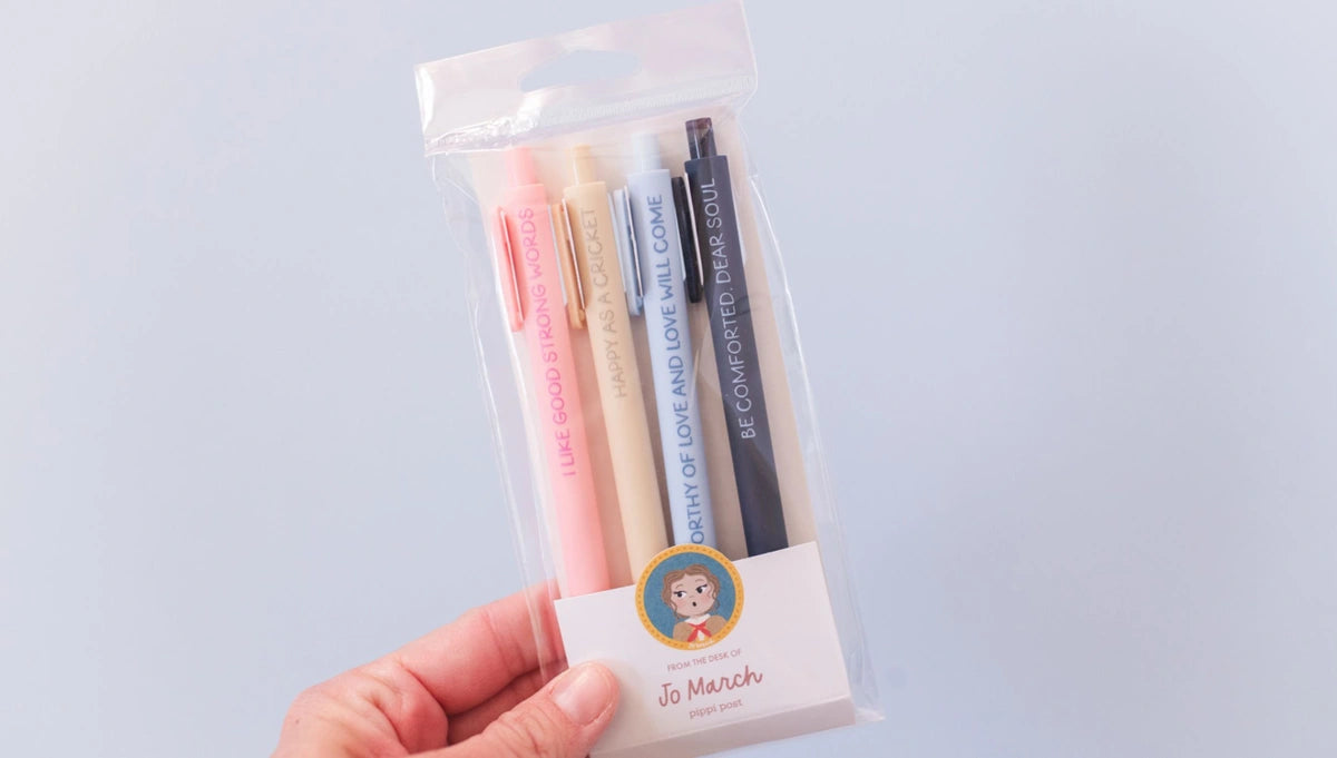 Celebrate the independent spirit of Jo March with the Little Women Jo March Pen Set. This collection features four gel ink pens, each engraved with empowering phrases inspired by Louisa May Alcott’s timeless novel. Ideal for writing, journaling, or creative projects, these pens encourage strength, creativity, and resilience. Perfect for fans, writers, and anyone seeking motivation, the set combines practical use with literary inspiration, making it a thoughtful gift and a daily reminder of Jo’s enduring wisdom. Enhance your writing experience with this unique and inspiring pen set.