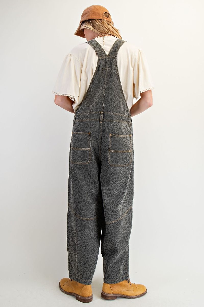 These Washed Animal Print Twill Overalls combine style and comfort with a relaxed, oversized silhouette and stretchy fabric. Featuring a convenient front kangaroo pocket, adjustable button straps, and button closures on the sides for easy wear. Practical back pockets add extra storage, while the wide-leg cut offers a trendy, loose fit. Designed with small measurements (inseam 21", outseam 35", shoulder strap length 21.25"), these overalls are perfect for a fashionable yet comfortable everyday look.