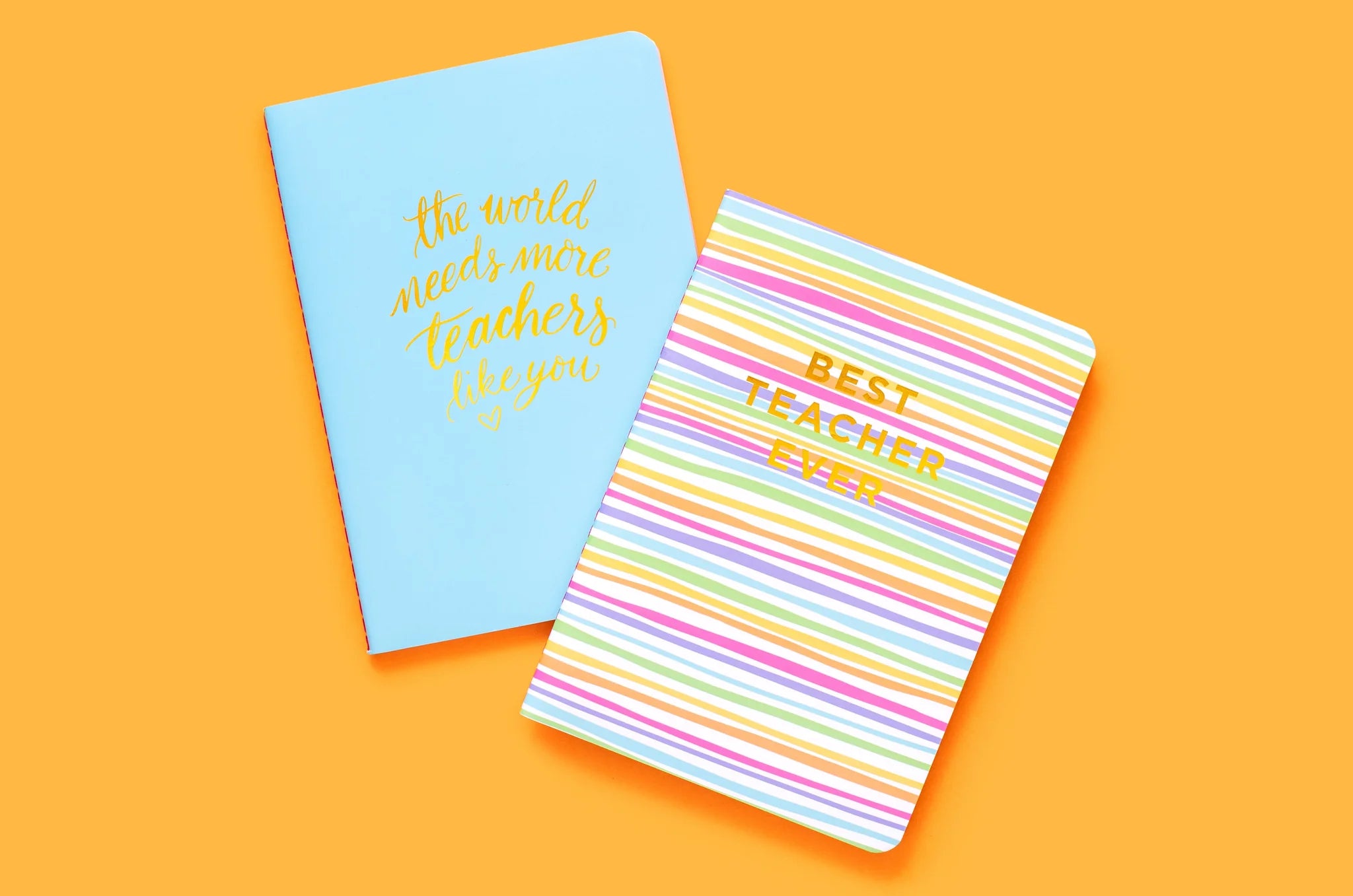 The Best Teacher Ever Notebook Set is an ideal gift for your favorite educators. This set includes two 5" x 7" notebooks—one with a solid teal cover and one with a vibrant rainbow stripe design—each featuring 50 lined pages and elegant gold foil imprinting. Packaged in shrink-wrapped, rounded-corner notebooks, these are perfect for jotting down notes or lesson plans. Add a pen and tie with a ribbon to create a thoughtful, stylish teacher gift. Imported for quality and charm.