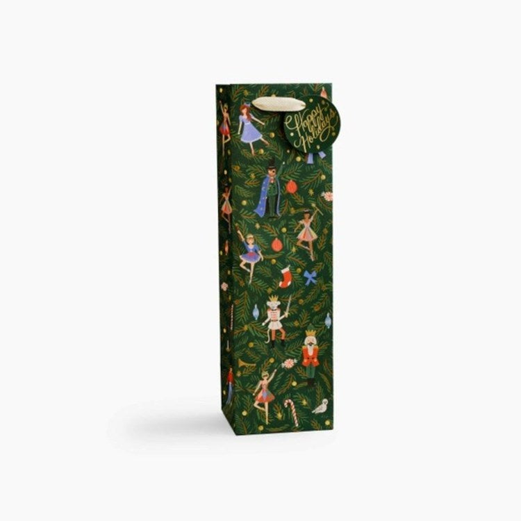 The Nutcracker Wine Gift Bag by Rifle Paper Co. combines festive charm with practical design, perfect for gifting your favorite bottle this holiday season. Featuring iconic Nutcracker-themed artwork, this durable bag securely holds standard wine bottles while adding a whimsical touch to your gift presentation. Ideal for holiday parties, hostess gifts, or seasonal celebrations, it elevates your wine gifting with style and festive spirit.