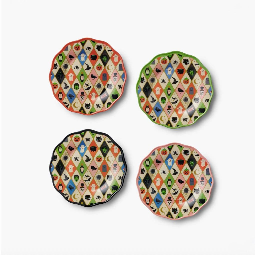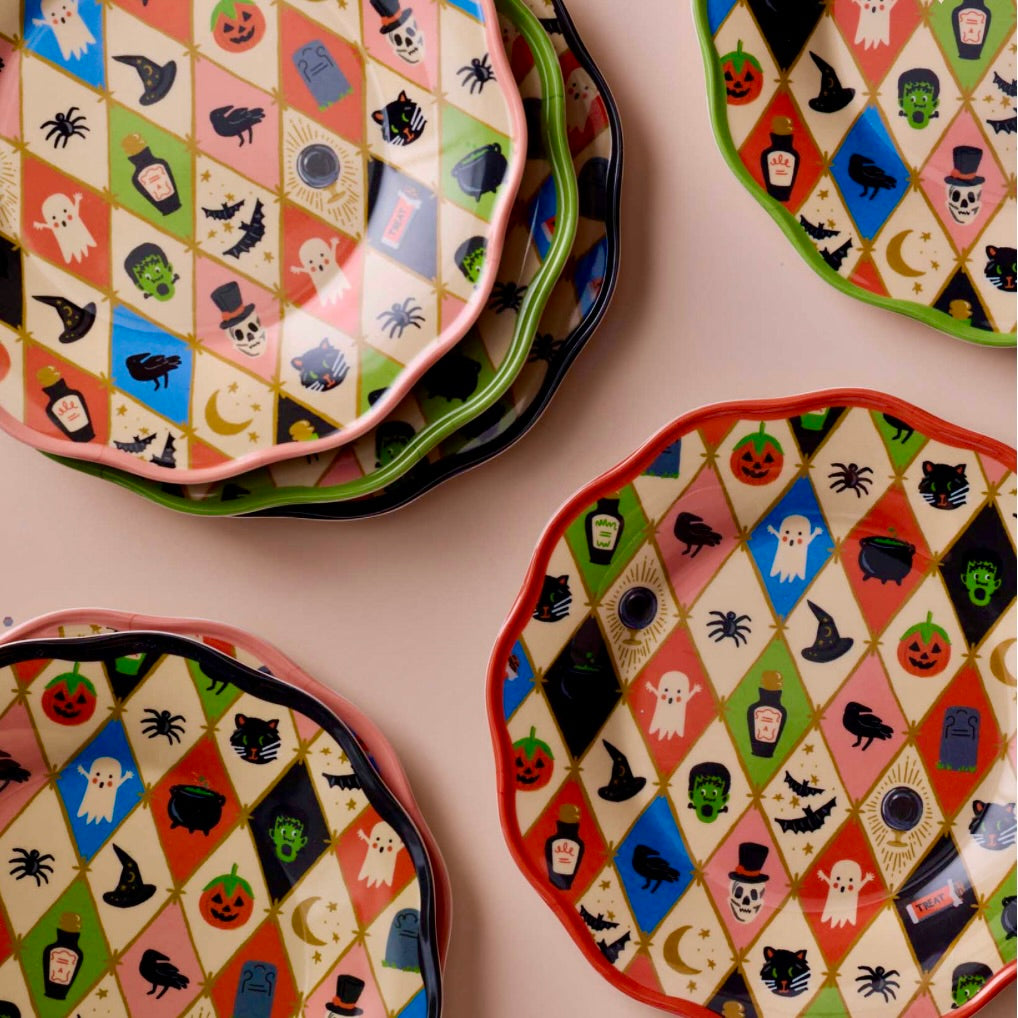 Serve treats with festive style using the Halloween Argyle Melamine Assorted Dessert Plates by Rifle Paper Company. Featuring a vibrant argyle pattern in Halloween colors, these durable plates are perfect for parties and seasonal gatherings. Made from sturdy melamine, they combine practicality with holiday charm, making them ideal for serving desserts or snacks throughout the spooky season.