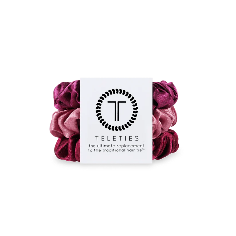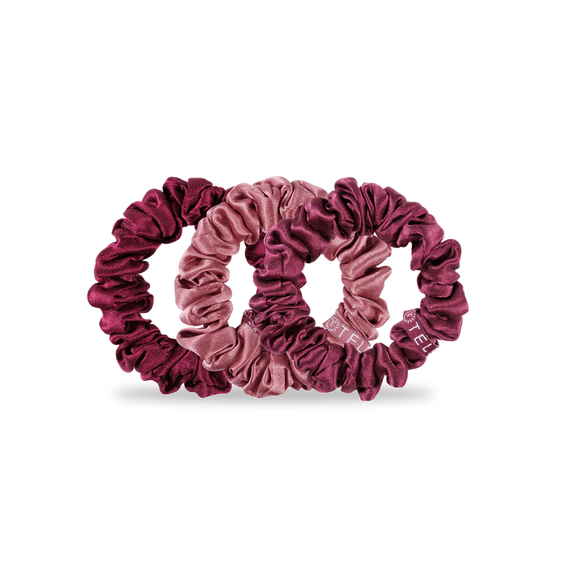 Keep your hair securely in place while protecting it with the Burgundy Bliss Silk Scrunchie Teleties. Featuring an innovative inner coil for a strong, non-slip grip, these scrunchies prevent damage, breakage, and creases. Wrapped in 100% natural silk, they offer a soft, comfortable feel that reduces headaches and adds a touch of style. Ideal for bedtime or daily wear, each pack includes three small scrunchies in a rich red hue, perfect for gentle and effective hair care.
