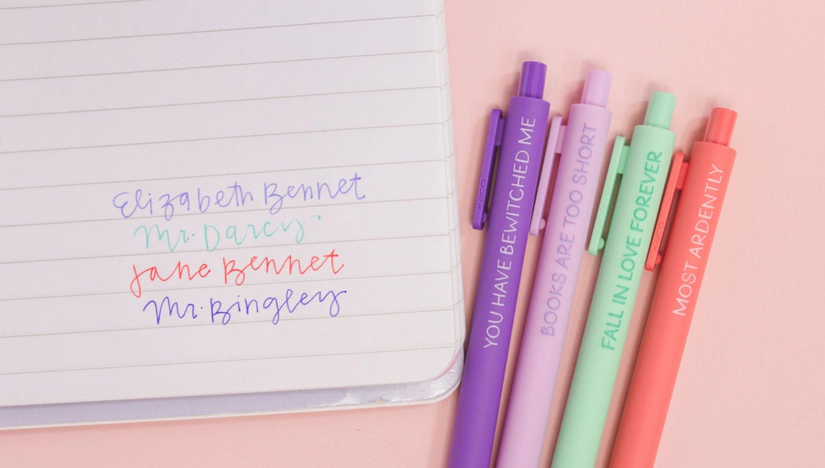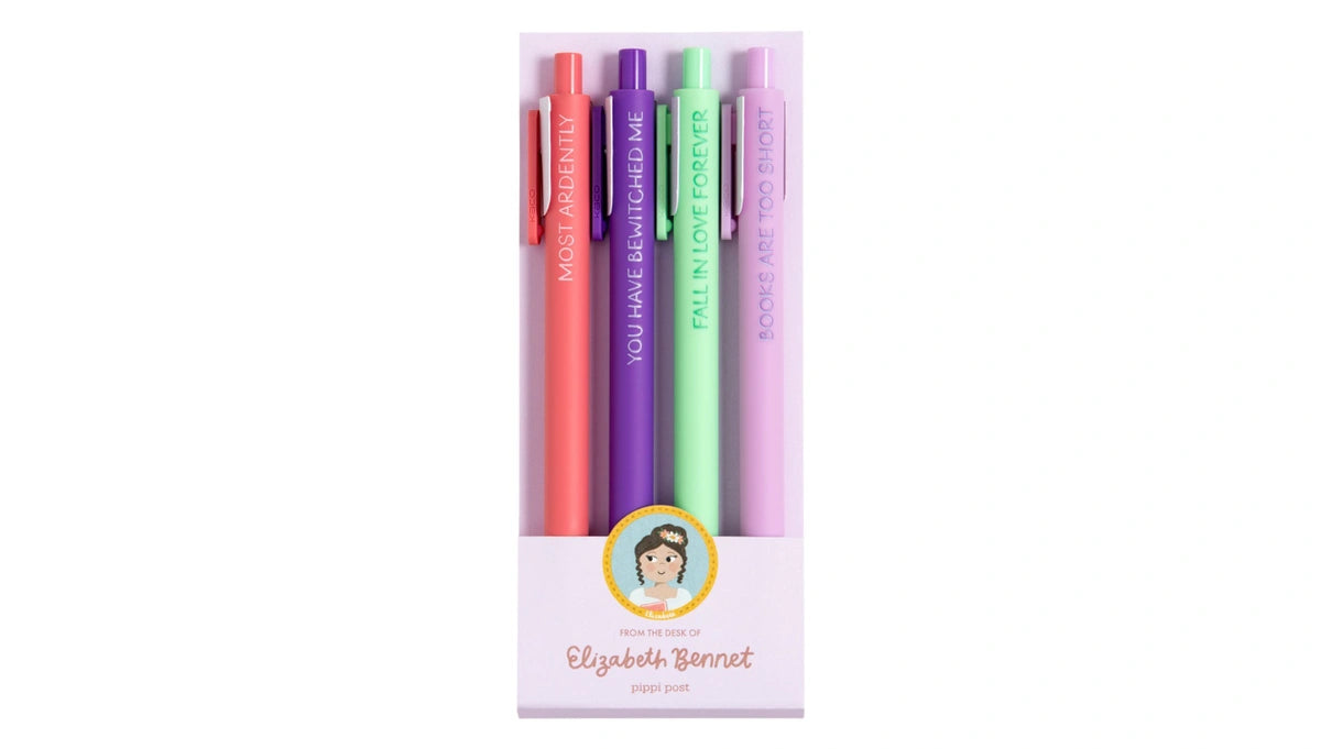 Celebrate literary charm with the Elizabeth Bennet Pen Set, inspired by Jane Austen’s iconic heroine. This set includes four click-style gel ink pens in pink, purple, mint, and lilac, each adorned with memorable quotes like “Most Ardently” and “You Have Bewitched Me.” Perfect for fans of classic literature, these pens bring a touch of Austen’s wit and spirit to everyday writing. Packaged in a compact 6”×2.25”×0.4” box, this set is ideal for note-taking, journaling, or gifting to book lovers. Add elegance and personality to your pen collection with this unique Pride & Prejudice-themed set.