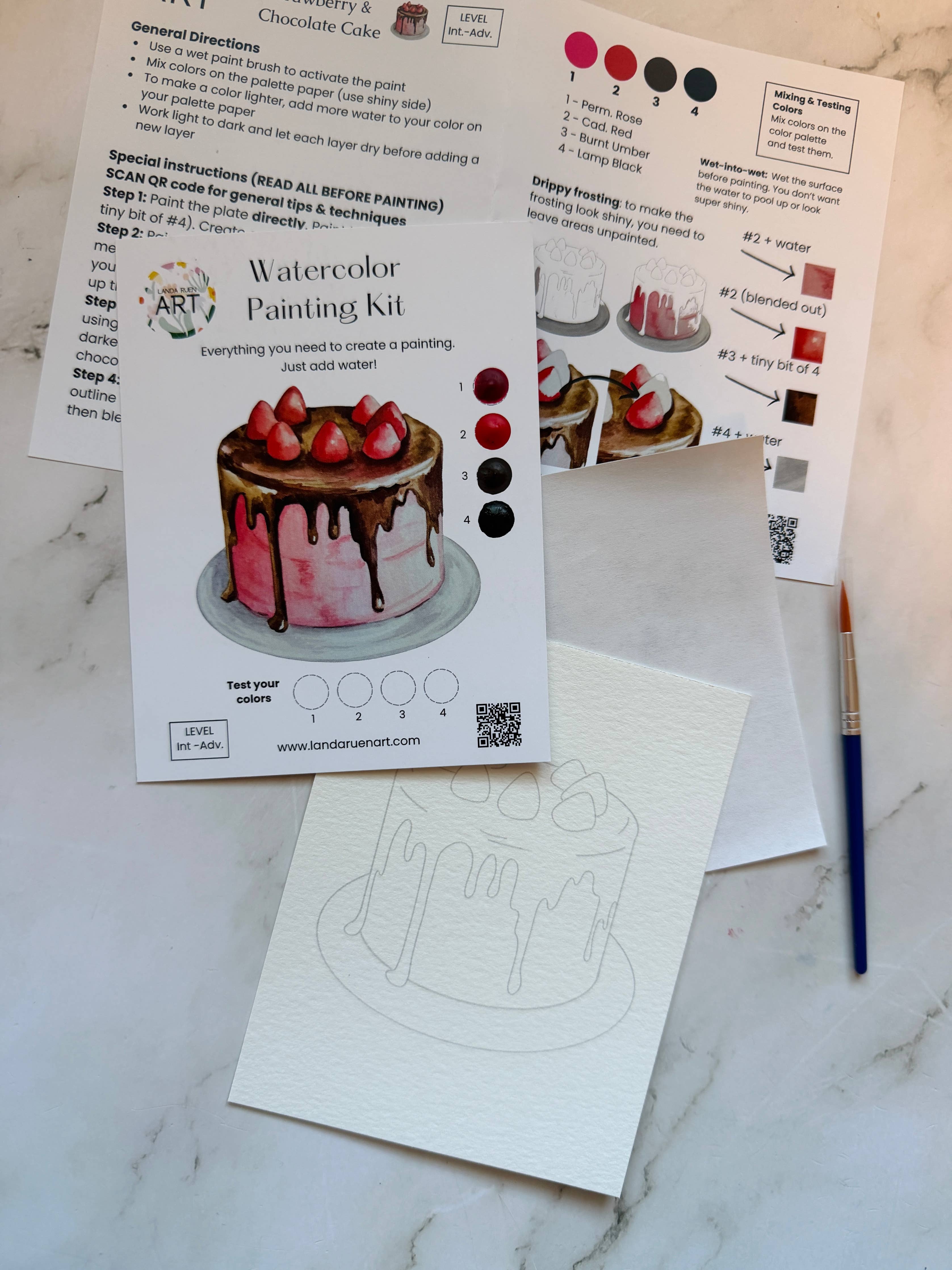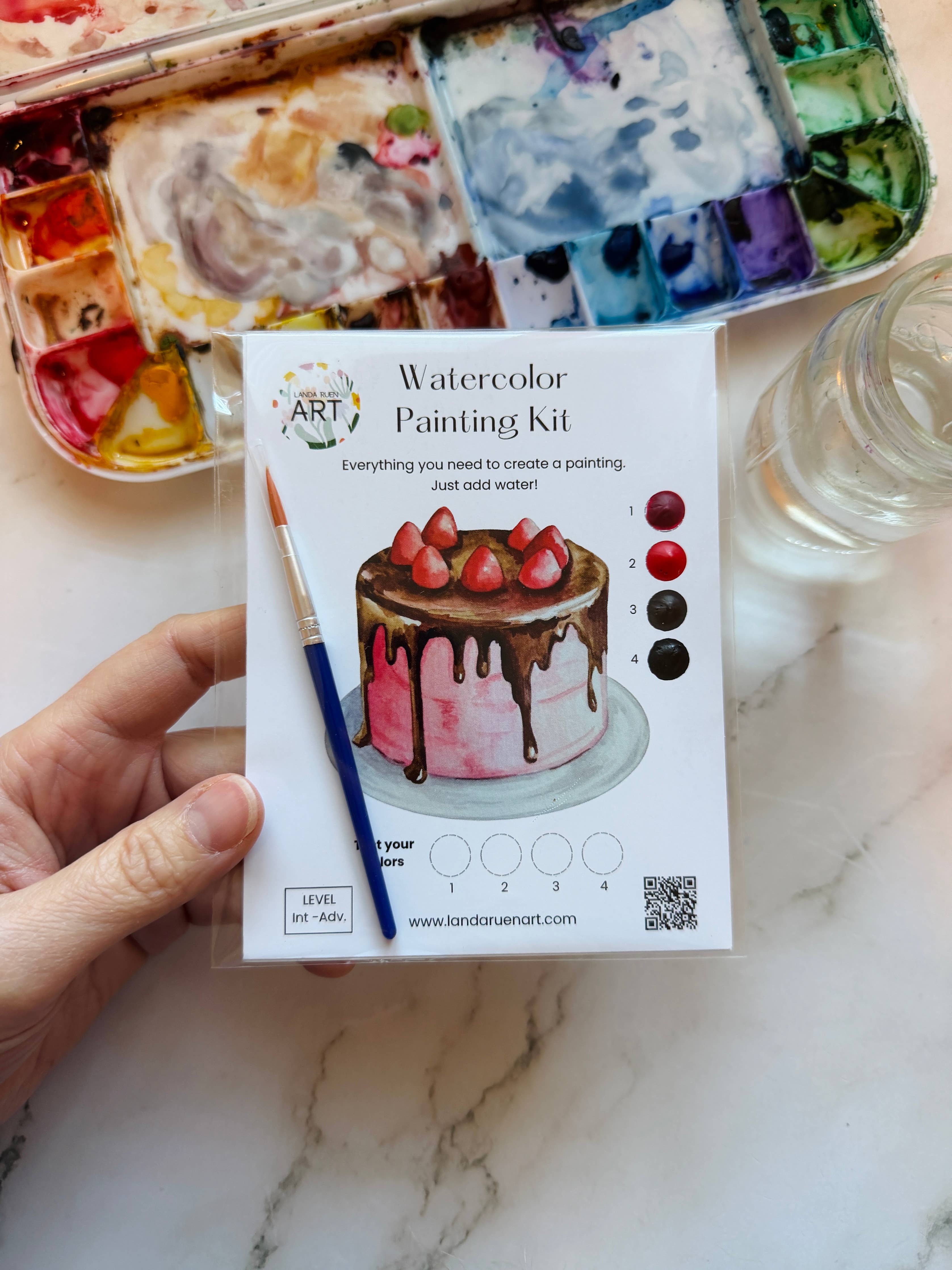 Cake Watercolor Kit – Complete Painting Set for All Skill Levels Create delicious-looking dessert art with this comprehensive watercolor painting kit. Designed for both beginners and seasoned artists, this set makes it simple to produce beautiful cake paintings ready to display or share. The kit contains everything required: pre-printed heavy-weight watercolor paper, professional-grade watercolor paints, quality paintbrush, mixing palette, and easy-to-follow instructions. Whether you paint it yourself as a personal creative project or gift the unpainted kit to an art lover, this versatile set delivers an enjoyable artistic experience. Perfect for solo painting sessions, group activities, or thoughtful gift-giving occasions.