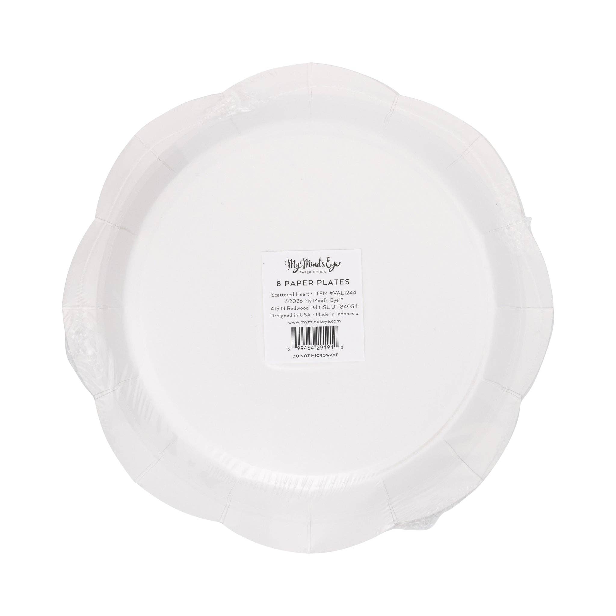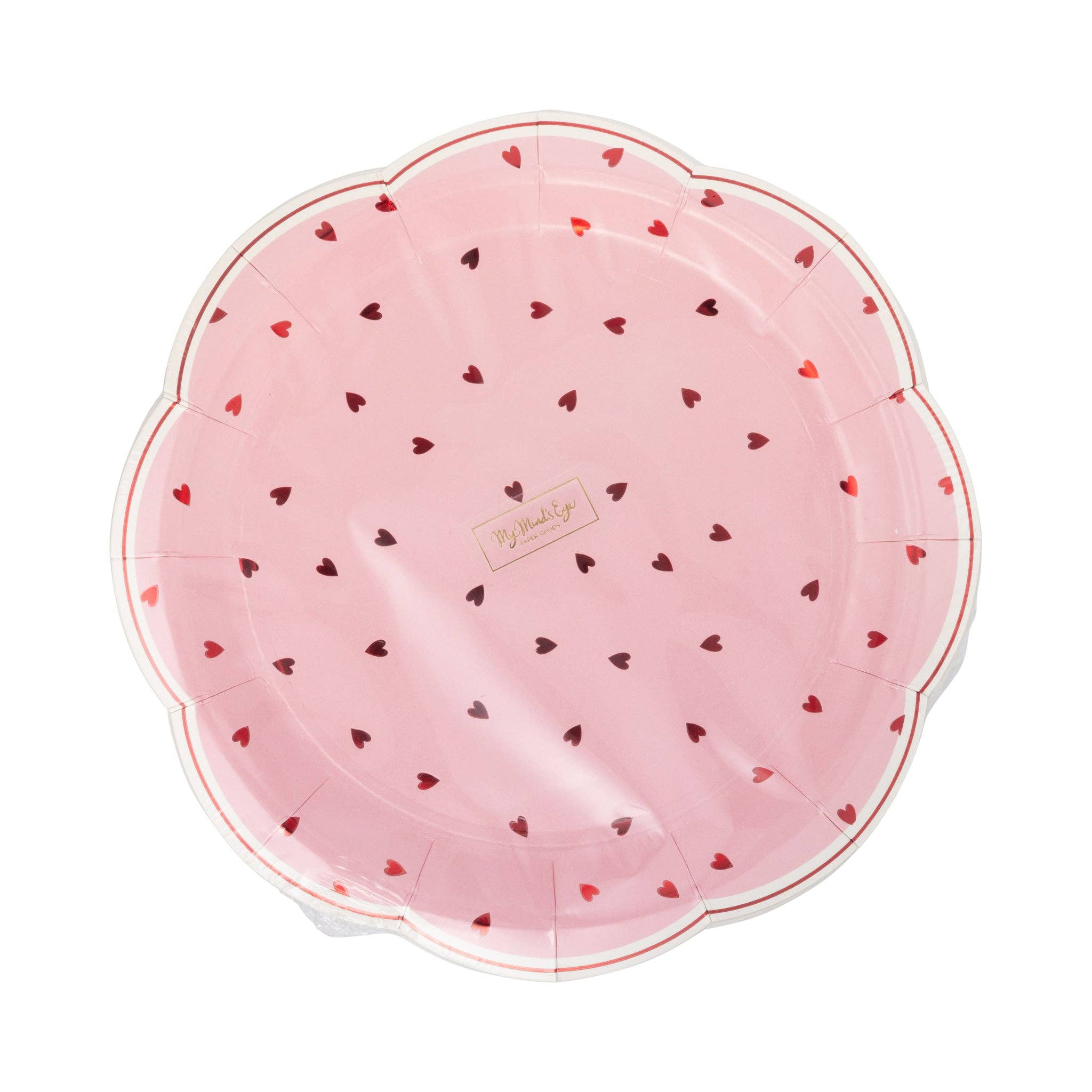 Celebrate love in style with this charming 9" scalloped plate featuring playfully scattered hearts! Perfect for Valentine's Day gatherings, romantic dinners, or any occasion calling for a touch of whimsy. The delicate scalloped edges add elegant detail while the cheerful heart design brings festive flair to your table. A delightful addition to your Valentine's Day tableware collection! • Pink and red scattered heart pattern • includes 8 scalloped paper plates • 9" x 9" • Accented with red foil details.