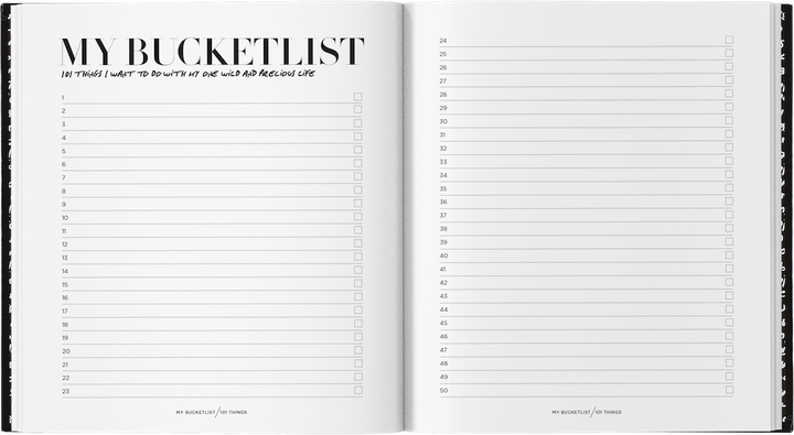 Capture your wildest dreams and desires in one place with My Bucket List. This best-selling journal, bound in elegant black cloth, is the perfect companion for your one wild and crazy life. From traveling down Route 66 in an open Cadillac to dancing in the rain, let this book inspire and guide you on your greatest adventures.