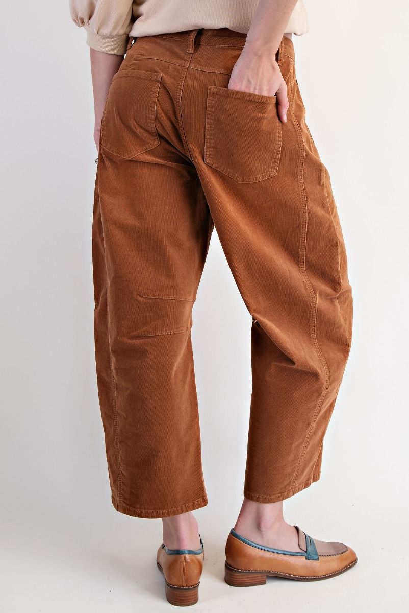 These Stretch Corduroy Barrel Pants feature a high-waisted design with a loose tapered leg and a cropped straight-leg cut for a modern silhouette. Crafted with functional side pockets, belt loops, and a zip fly with button closure, they offer both style and convenience. Perfect for flattering your figure, the small size includes precise measurements for a tailored fit: 25" inseam, 36.5" outseam, and 14.75" waist. Ideal for effortless everyday wear, these pants combine comfort with a chic, versatile look.