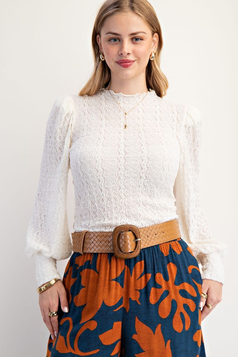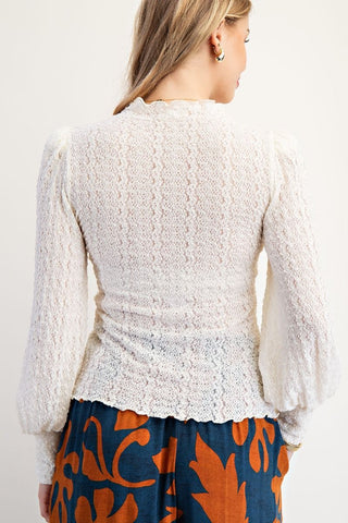 Elevate your wardrobe with this Textured Lace Fitted Top featuring a high neckline accented by a subtle ruffle trim for a delicate touch. The fitted bodice and scalloped hemline enhance your silhouette, while slight puff shoulders and full-length bishop balloon sleeves with elastic cuffs add elegant volume. Designed with small measurements—23" length and 16" bust—this top combines classic lace texture with modern details, perfect for stylish layering or standout solo wear.