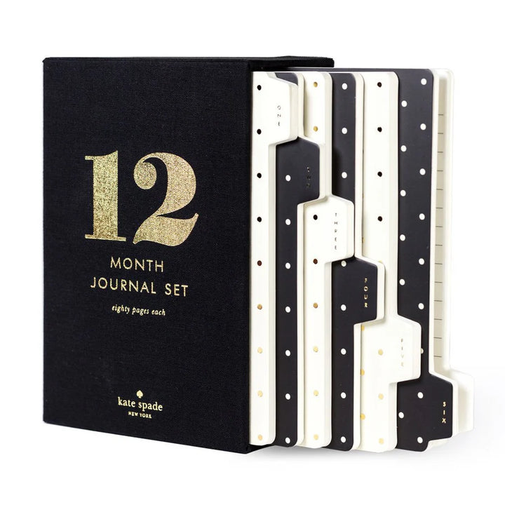 Easily capture every thought, memory, and more with the Twelve Month Journal from Kate Spade New York. This set of 12 tabbed journals, featuring 80 lined pages each, is perfect for doodling, journaling, and beyond. Plus, with its compact size of 6.5 x 4.25 inches, it's great for on-the-go use.