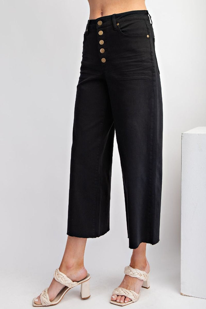 Boost your style with our trendy Wide Leg Twill Pants. Designed with a button front for a polished look and a stretch twill fabric for comfortable wear. Featuring a flattering wide leg silhouette, slimming high waist, and a raw hem for a touch of edge. Perfect for any occasion with the 4 pocket style, and easily paired with any top. Model is 5'9 and looking fabulous.